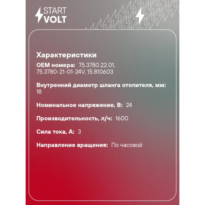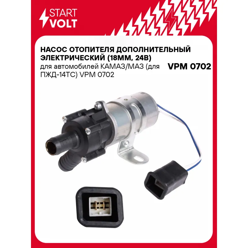 Насос отопителя дополнительный электрический (18мм, 24В) для автомобилей КАМАЗ/МАЗ (для ПЖД-14ТС) Характеристики: Артикул: VPM 0702 OEM номера: 75.3780.22.01, 75.3780-21-01-24V, 15.810603 Номинальное напряжение, В: 24 Производительность, л/ч: 1600 Сила тока, А: 3 Направление вращения: по часовой Внутренний диаметр шланга отопителя, мм: 18 Количество на автомобиль: 1 Комплектация: Паспорт изделия/гарантийный талон - 1 шт Насос отопителя дополнительный - 1 шт Гарантия: от 1 года.