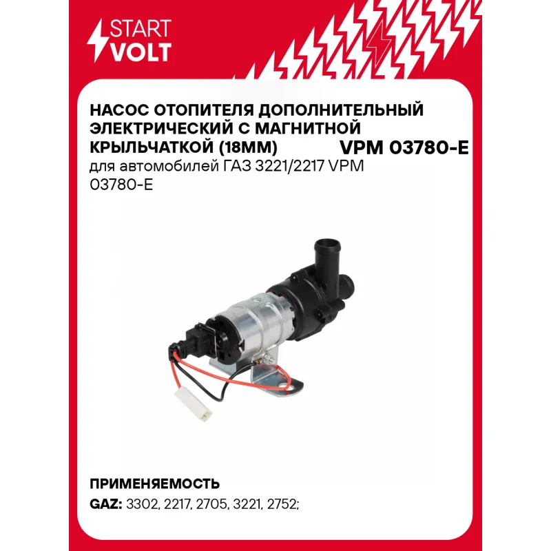 Насос отопителя дополнительный электрический с магнитной крыльчаткой (18мм) для автомобилей ГАЗ 3221/2217 Характеристики: Артикул: VPM 03780-E OEM номера: 351-3730010-10 Количество на автомобиль: 1 Номинальное напряжение, В: 12 Сила тока, А: 1.5 Производительность, л/ч: 1100 Направление вращения: по часовой стрелке Внутренний диаметр шланга отопителя, мм: 18 Подходит для авто: ГАЗ 3302, 3302, 2217, 2217, 2705, 2705, 3221, 3221, 2752, 2752 Для проверки применяемости отправьте VIN автомобиля через вкладку "Есть вопросы о товаре?" Комплектация: Паспорт изделия/гарантийный талон - 1 шт Насос отопителя дополнительный - 1 шт Гарантия: от 1 года.