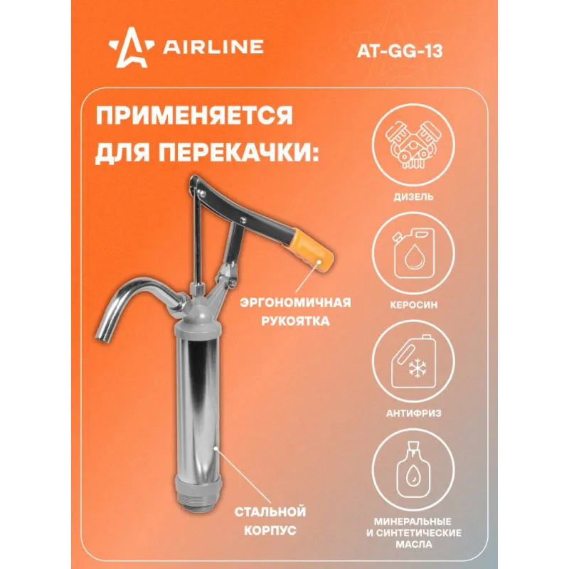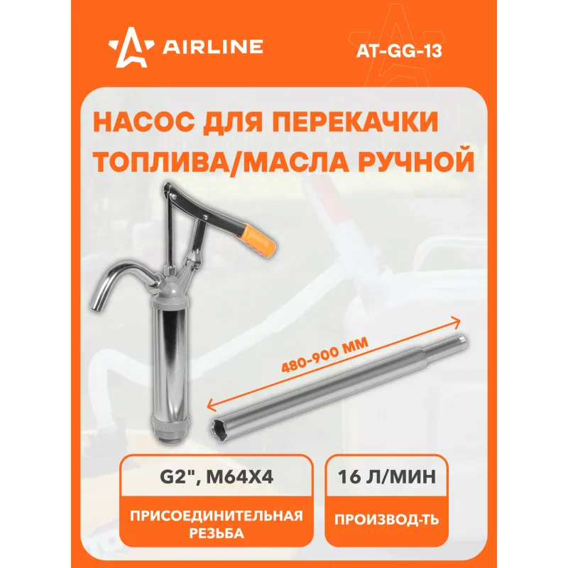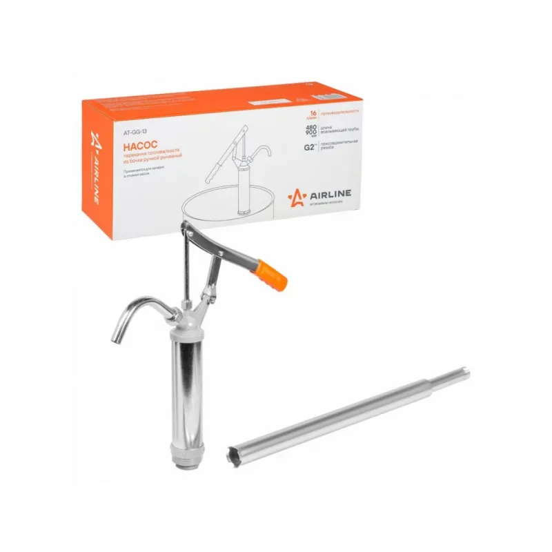 Насос перекачки топлива/масла из бочки ручной рычажный Описание: Ручной насос для перекачки топлива, масел и технических жидкостей AT-GG-13 от бренда AIRLINE - изготовлен из стали с применением маслобензостойкой резины в местах уплотнений и на поршне. Механический насос автомобильный разработан для перекачивания из стандартных бочек различных технических жидкостей, таких как: дизельное топливо/дизель, керосин, минеральные и синтетические масла, концентраты охлаждающих жидкостей и др. Подходит для перекачки и замены масла. Производительность - 16 л/мин. Длина всасывающей трубы - 480-900 мм. Возможно применение насоса для откачки масла в транспортных средствах: мотоциклы, автомобили, квадроциклы, лодки, а также в промышленном/медицинском оборудовании. НЕ РЕКОМЕНДУЕТСЯ применять насос для ГСМ для перекачивания воды, жидкостей на её основе, а также сильных кислот и других агрессивных жидкостей. Характеристики: Артикул: AT-GG-13 OEM номера: 42031 Присоединительная резьба: G2", M64x4 Производительность, л/мин: 16 Длина всасывающей трубы, мм: 480-900 Комплектация: Насос - 1 шт Труба подающая телескопическая - 1 шт Излив стальной - 1 шт Гарантия: от 1 года.