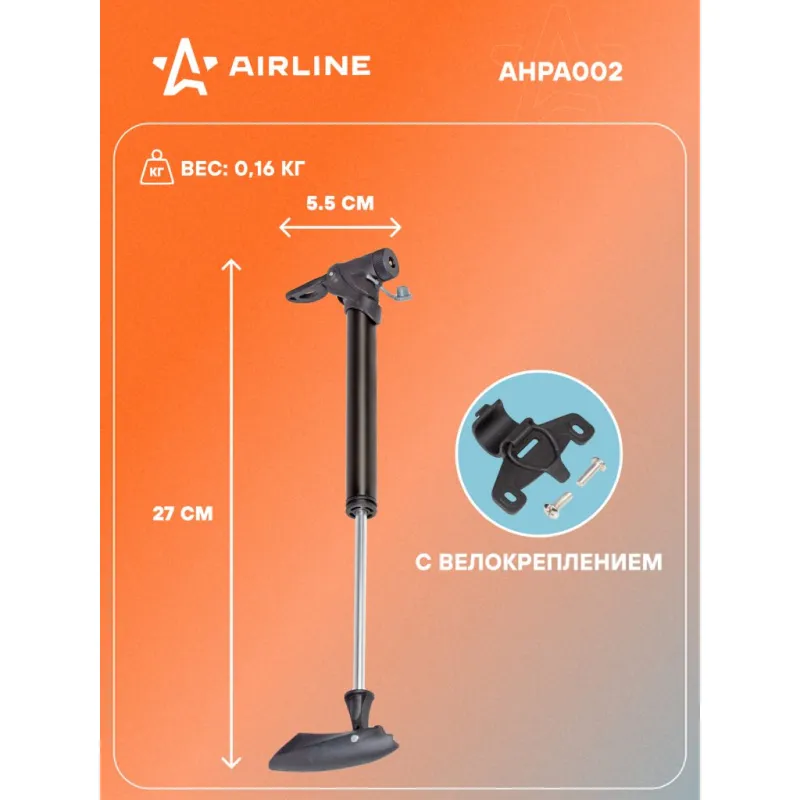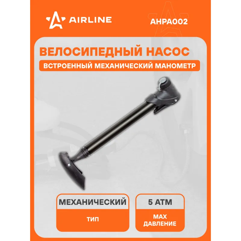 Насос велосипедный Описание: Компактный насос AIRLINE AHPA002 с креплением к раме велосипеда. Удобная Т-образная ручка упрощает накачку. Подходит для автомобильных (Schrader) ниппелей. Продается высококачественный велосипедный насос, который станет незаменимым аксессуаром для любого велосипедиста. Этот компактный и портативный насос легко поместится в вашем рюкзаке или кармане, готовый прийти на помощь в случае прокола шины или необходимости подкачать воздух в колесах. Этот ручной насос подойдет для накачки не только велосипедных колес, а также для накачки мяча, детскую и инвалидную коляску, тачку, мопед, мотоцикл, воздушные шары, батут, футбольный, волейбольный, баскетбольный мяч. Насос для накачки велосипедных шин - это необходимая вещь и будет хорошим подарком владельцу велосипеда, для вашего мужчины или друга на 23 февраля, 8 марта, новый год, так как насос может выручить в непредвиденной ситуации. В линейке AIRLINE, вы найдете широкий ассортимент высококачественных автотоваров и средств по уходу за вашим автомобилем, инструменты для авто, велосипедов, насосы ручные, ножные, механические, компрессоры. Мы гарантируем качество и надежность наших товаров. Характеристики: Артикул: AHPA002 Манометр: Нет Длина шланга, м: Нет Максимальное давление, Атм (кг/см2): 5 Тип: Механический Комплектация: Насос ручной - 1 шт Картонная подложка - 1 шт Гарантия: от 1 года.