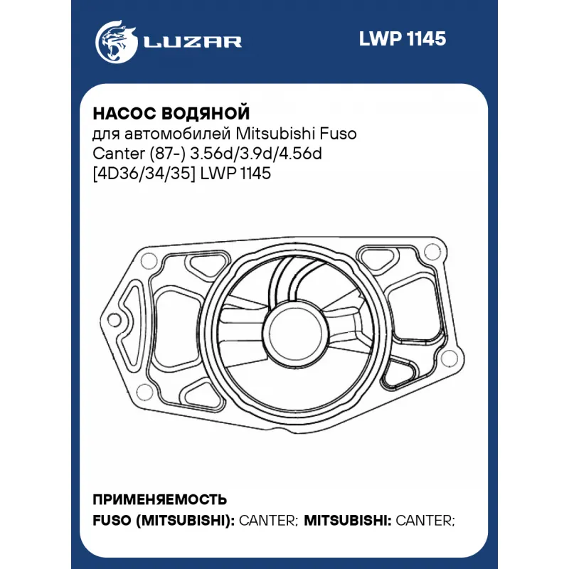 Насос водяной для автомобилей Mitsubishi Fuso Canter (87-) 3.56d/3.9d/4.56d [4D36/34/35] Характеристики: Артикул: LWP 1145 OEM номера: ME015217, ME995424, ME995426, ME996868 Трансмиссия: Механическая коробка передач Кондиционер: +/- Материал крыльчатки: Сталь Комплектация: Насос водяной Прокладка уплотнительная Паспорт изделия Гарантия: от 1 года.