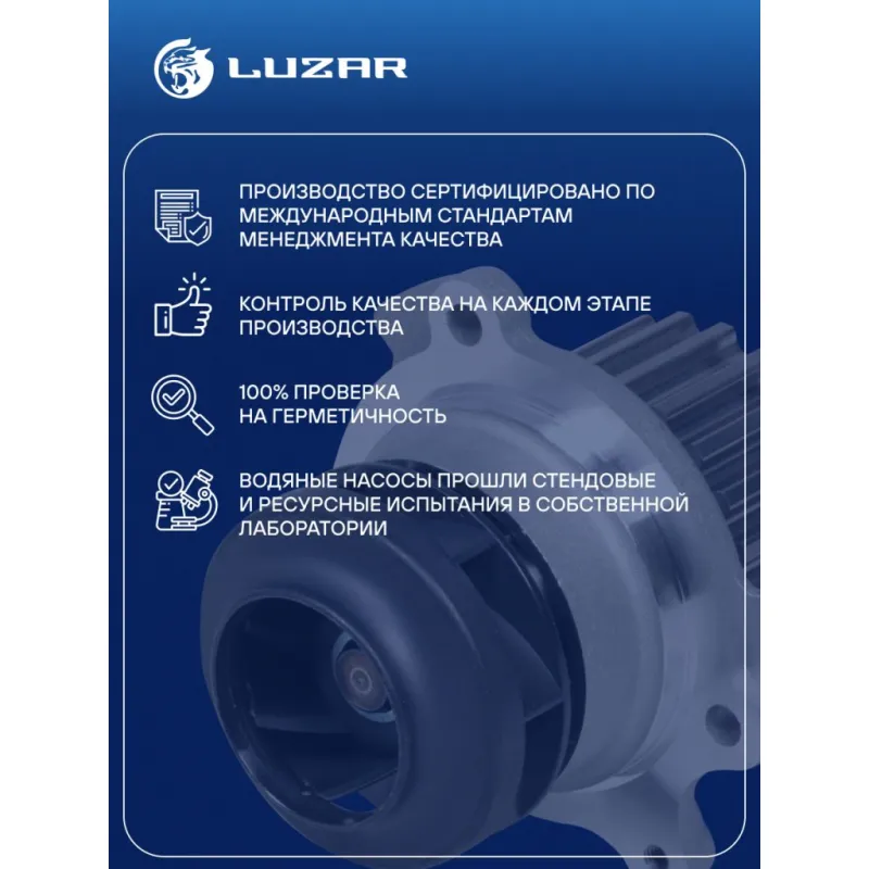 | Особенности конструкции: | Разработана специально для мотора 21179 (1.8i), имеет наибольшую производительность среди линейки помп LUZAR Turbo |