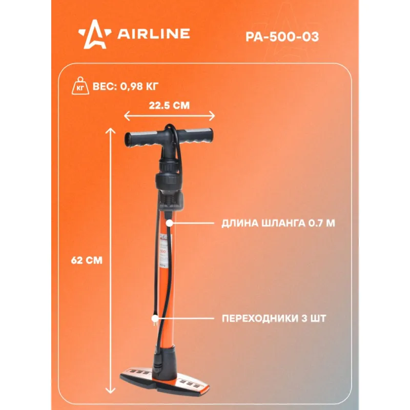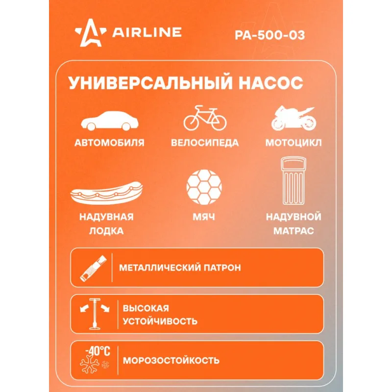 Насос воздушный 500 с манометром (ручной, механический, 500 см3) Описание: Насос воздушный ручной механический PA-500-03 бренда Airline с самой большой емкостью цилиндра . Компактные размеры и легкость в накачивании колес и других надувных изделий сделали насос популярным среди автолюбителей. В отличии от компрессора, насос не зависит от бортовой сети автомобиля и наличия прикуривателя. Представлен в традиционной форме хорошо знакомого ручного насоса, изготовлен с использованием высокопрочных материалов, которые не подвержены перепадам температур и коррозии при морозных условиях. Длина соединительного провода устройства составляет 70 см. Данной длины достаточно для комфортной эксплуатации насоса. Насос имеет манометр, который можно закрепить в любом удобном месте. Металлический патрон и насадки, которые хранятся в ручке насоса, позволят гарантированно добраться до ниппеля любого колеса, а так же накачать другие надувные изделия. Металлический патрон и насадки, позволяют гарантированно добраться до ниппеля любого колеса, а также накачать другие надувные изделия. Это универсальный насос для автомобиля, позволяющий без особых усилий, быстро установить необходимое давление в колёсах. Насос для накачки шин - это необходимая вещь и будет хорошим подарком автомобилисту, владельцу авто, для вашего мужчины или друга на 23 февраля, 8 марта, новый год, день рождения, день автомобилиста, так как насос может выручить в непредвиденной ситуации. В линейке AIRLINE, вы найдете широкий ассортимент высококачественных автотоваров и средств по уходу за вашим автомобилем, инструменты для авто, велосипедов, насосы ручные, ножные, механические, компрессоры. Мы гарантируем качество и надежность наших товаров. Характеристики: Артикул: PA-500-03 Манометр: Встроенный механический Длина шланга, м: 0,7 Объем цилиндра, см3: 500 Максимальное давление, Атм (кг/см2): 5 Тип: Механический Комплектация: Насос ручной воздушный - 1 шт Стандартные переходники-насадки - 2 шт Паспорт изделия AIRLINE - 1 шт Гарантийный талон AIRLINE - 1 шт Пакет с цветным навершием - 1 шт Гарантия: от 1 года.