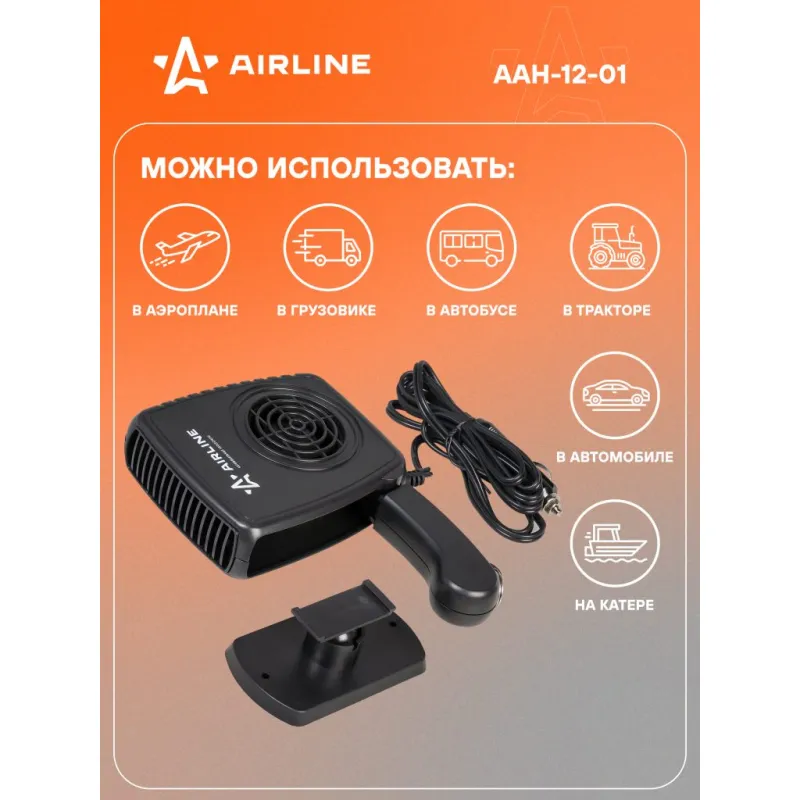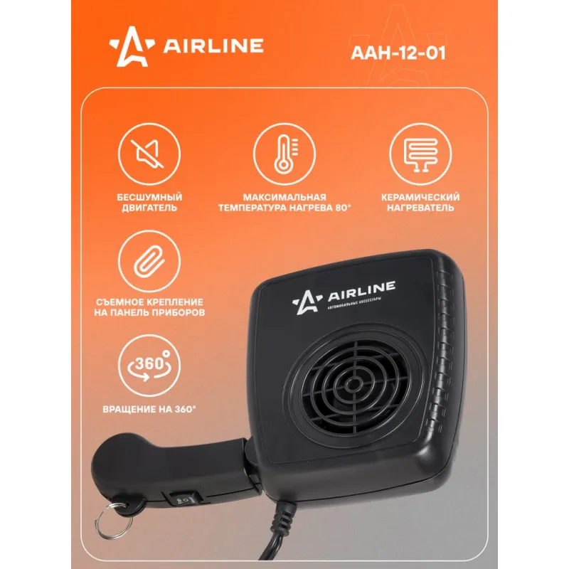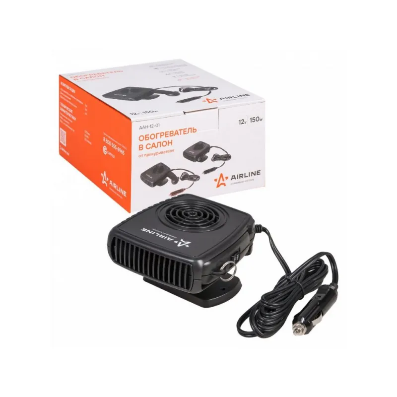 Обогреватель в салон от прикуривателя 12В 150Вт Описание: Тепловентилятор / обогреватель для машины от прикуривателя лобового стекла 12 В 150 Вт на липкой ленте AAH-12-01 Автомобильный обогреватель позволяет максимально быстро увеличить температуру в салоне транспортного средства, а также изделие играет роль вентилируемого устройства при жарких погодных условиях. Для удобства при эксплуатации предусмотрена подставка, расположенная под корпусом изделия, а также откидная ручка. Обогреватель работает от сети прикуривателя автомобиля с напряжением питания 12 В. Особенности: * Керамический нагреватель; * Съемное крепление на панель приборов; * Бесшумный двигатель; * Длина провода - 1,5 м; Стильный компактный обогреватель в машину или автодом подарит возможность комфортно путешествовать в машине, как источник дополнительного тепла, поможет обогреть салон автомобиля, лобовое стекло, и будет отличным приобретением в подарок владельцу автомобиля, мужчине и женщине, автолюбителю, папе, отцу, мужу, парню и другу. Товар официального производителя AIRLINE. Характеристики: Артикул: AAH-12-01 Длина провода, м: 1,5 Мощность, Вт: 150 Напряжение питания, В: 12 Максимальная температура нагрева: 80 Режим работы: обдув, обогрев Факт. потребляемый ток, (А): 12,5 Комплектация: Обогреватель с кабелем и штекером - 1 шт Двусторонняя липкая лента - 1 шт Паспорт изделия - 1 шт Гарантийный талон - 1 шт Упаковочная коробка - 1 шт Гарантия: от 1 года.