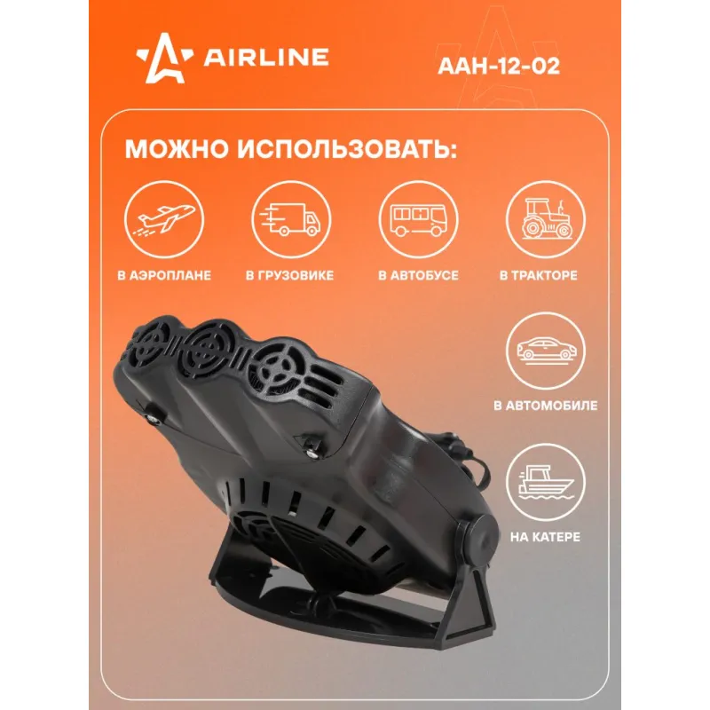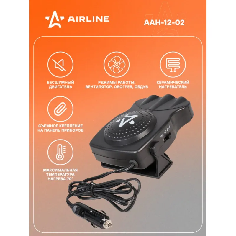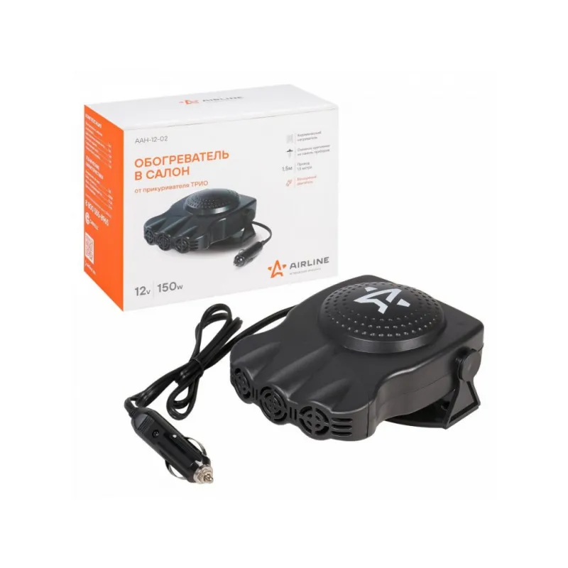 Обогреватель в салон от прикуривателя ТРИО 12В 150Вт Описание: Тепловентилятор / обогреватель для машины от прикуривателя лобового стекла 12 В 150 Вт на липкой ленте AAH-12-02 Автомобильный обогреватель используется для нагрева воздуха или обдува в салоне автомобиля. Позволяет быстро разморозить стёкла автомобиля и препятствует их запотеванию. Обогреватель работает от сети прикуривателя автомобиля с напряжением питания 12 В. Особенности: * Керамический нагреватель; * Съемное крепление на панель приборов; * Бесшумный двигатель; * Длина провода - 1,5 м; Стильный компактный обогреватель в машину или автодом подарит возможность комфортно путешествовать в машине, как источник дополнительного тепла, поможет обогреть салон автомобиля, лобовое стекло, и будет отличным приобретением в подарок владельцу автомобиля, мужчине и женщине, автолюбителю, папе, отцу, мужу, парню и другу. Товар официального производителя AIRLINE. Характеристики: Артикул: AAH-12-02 Длина провода, м: 1,5 Мощность, Вт: 150 Напряжение питания, В: 12 Максимальная температура нагрева: 70 Режим работы: обдув, обогрев Комплектация: Обогреватель с кабелем и штекером - 1 шт Двусторонняя липкая лента - 1 шт Паспорт изделия - 1 шт Гарантийный талон - 1 шт Упаковочная коробка - 1 шт Гарантия: от 1 года.