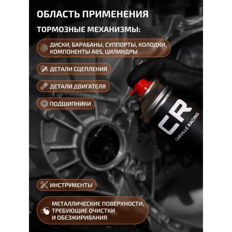 | Область применения | Тормозные механизмы: диски, барабаны, суппорты, колодки, компоненты ABS, цилиндры; Детали сцепления; Детали двигателя; Подшипники; Инструменты. Металлические поверхности, требующие очистки и обезжиривания. |