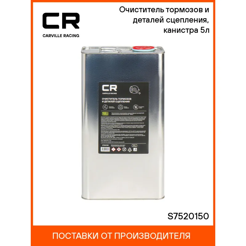 Очиститель тормозов и деталей сцепления, канистра 5л Описание: Универсальный очиститель Carville Racing. Эффективно удаляет сильные масляные загрязнения, смазку, нагар, продукты выработки тормозных механизмов, тормозную жидкость. Полностью обезжиривает металлические поверхности и быстро высыхает. Характеристики: Артикул: S7520150 OEM номера: 1781419, 7711422414, PZ447-00PA0-05, PZ447-00PA0-25, PZ447-00PA0-50 Состав: алифатические углеводороды >30%, нафтеновые углеводороды >30%, ароматические углеводороды