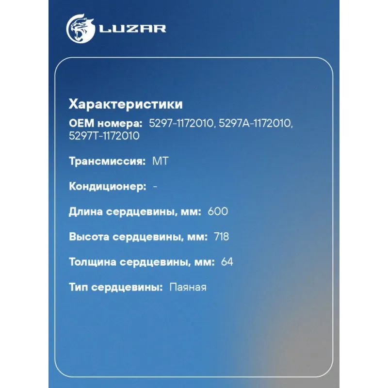 ОНВ (радиатор интеркулера) для автобусов НЕФАЗ-5299 Характеристики: Артикул: LRIC 0702 OEM номера: 5297-1172010, 5297А-1172010, 5297T-1172010 Трансмиссия: MT Кондиционер: - Длина сердцевины, мм: 600 Высота сердцевины, мм: 718 Толщина сердцевины, мм: 64 Материал сердцевины: алюминий Материал бачков: алюминий Тип сердцевины: паяна... Читать полностью →