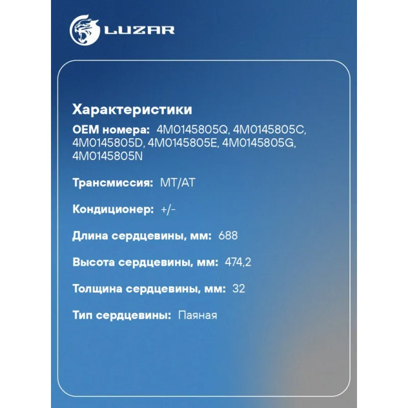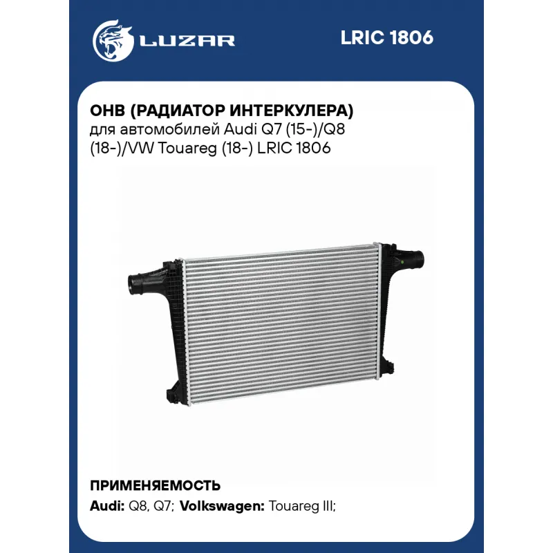 ОНВ (радиатор интеркулера) для автомобилей Audi Q7 (15-)/Q8 (18-)/VW Touareg (18-) Характеристики: Артикул: LRIC 1806 OEM номера: 4M0145805Q, 4M0145805C, 4M0145805D, 4M0145805E, 4M0145805G, 4M0145805N Трансмиссия: MT/AT Кондиционер: +/- Длина сердцевины, мм: 688 Высота сердцевины, мм: 474.2 Толщина сердцевины, мм: 32 Материал сердцевины: алюминий Тип сердцевины: паяная Сопутствующий товар: Радиаторы охлаждения: LRc 1830 Подходит для авто: Audi Q8 (18-), Q7 (15-) Volkswagen Touareg III (18-), Touareg III (18-) Для проверки применяемости отправьте VIN автомобиля через вкладку "Есть вопросы о товаре?" Комплектация: Радиатор интеркулера Паспорт изделия Гарантия: от 1 года.