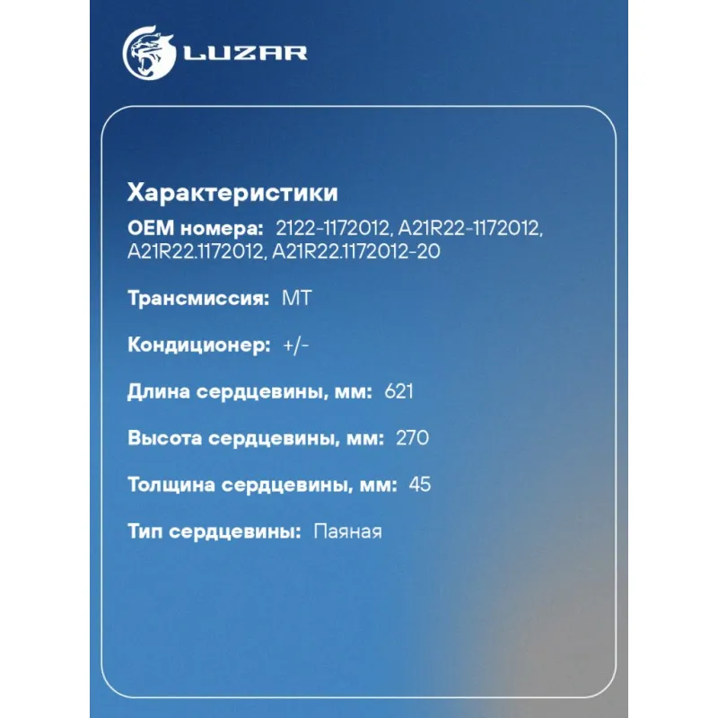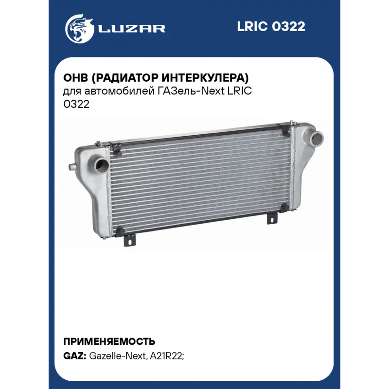ОНВ (радиатор интеркулера) для автомобилей ГАЗель-Next Характеристики: Артикул: LRIC 0322 OEM номера: 2122-1172012, A21R22-1172012, А21R22.1172012, A21R22.1172012-20 Трансмиссия: MT Кондиционер: +/- Длина сердцевины, мм: 621 Высота сердцевины, мм: 270 Толщина сердцевины, мм: 45 Материал сердцевины: алюминий Тип сердцевины: паяная Сопутствующий товар: Радиаторы охлаждения: LRc 0321, LRc 0322b Подходит для авто: ГАЗ Gazelle-Next (13-), A21R22 Для проверки применяемости отправьте VIN автомобиля через вкладку "Есть вопросы о товаре?" Комплектация: Радиатор интеркулера Паспорт изделия Гарантия: от 1 года.