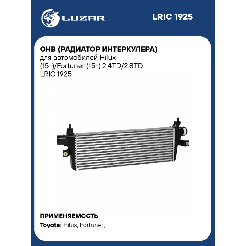 ОНВ (радиатор интеркулера) для автомобилей Hilux (15-)/Fortuner (15-) 2.4TD/2.8TD Характеристики: Артикул: LRIC 1925 OEM номера: 17940-0L130, 17940-0L110 Трансмиссия: MT/AT Кондиционер: +/- Длина сердцевины, мм: 590 Высота сердцевины, мм: 202 Толщина сердцевины, мм: 50 Материал сердцевины: алюминий Тип сердцевины: паяная Сопутствующий товар: Радиаторы охлаждения: LRc 1975 Подходит для авто: Toyota Hilux (15-), Fortuner (15-) Для проверки применяемости отправьте VIN автомобиля через вкладку "Есть вопросы о товаре?" Комплектация: Радиатор интеркулера Паспорт изделия Гарантия: от 1 года.
