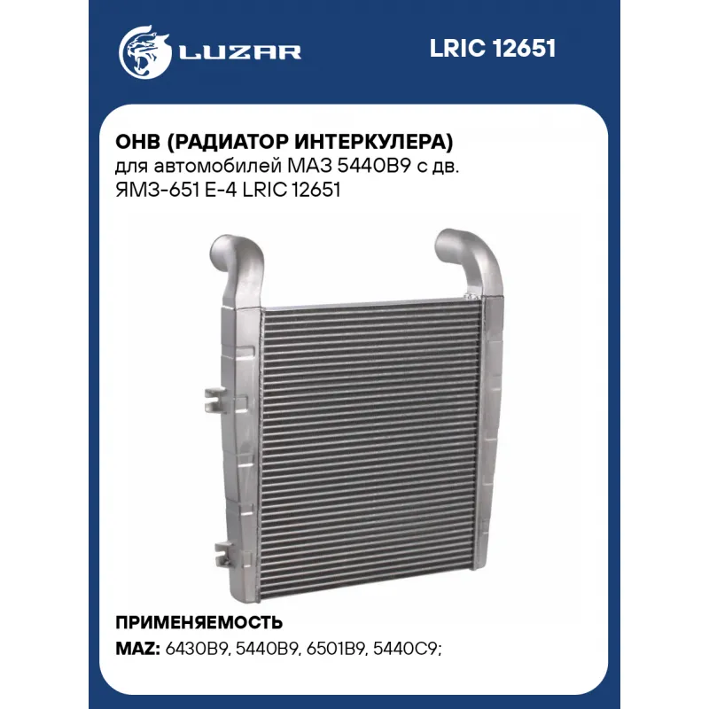 ОНВ (радиатор интеркулера) для автомобилей МАЗ 5440B9 с дв. ЯМЗ-651 E-4 Характеристики: Артикул: LRIC 12651 OEM номера: 5440В9-1323010, 5440B9-1323010, 5440В9К.1323010, 5440B9K.1323010 Трансмиссия: MT Кондиционер: +/- Длина сердцевины, мм: 717 Высота сердцевины, мм: 647 Толщина сердцевины, мм: 62 Материал сердцевины: алюминий Материал бачков: алюминий Тип сердцевины: паяная Сопутствующий товар: Радиаторы охлаждения: LRc 1240 Подходит для авто: МАЗ 6430В9, 5440B9, 6501B9, 5440С9, 6430C9 Для проверки применяемости отправьте VIN автомобиля через вкладку "Есть вопросы о товаре?" Комплектация: Радиатор интеркулера Паспорт изделия Гарантия: от 1 года.