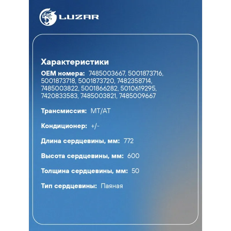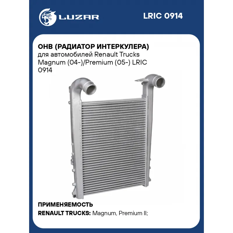 ОНВ (радиатор интеркулера) для автомобилей Renault Trucks Magnum (04-)/Premium (05-) Характеристики: Артикул: LRIC 0914 OEM номера: 7485003667, 5001873716, 5001873718, 5001873720, 7482358714, 7485003822, 5001866282, 5010619295, 7420833583, 7485003821, 7485009667 Трансмиссия: MT/AT Кондиционер: +/- Длина сердцевины, мм: 772 Высота сердцевины, мм: 600 Толщина сердцевины, мм: 50 Материал сердцевины: алюминий Тип сердцевины: паяная Сопутствующий товар: Радиаторы охлаждения: LRc 0934 Подходит для авто: RENAULT TRUCKS Magnum (04-), Premium II (05-) Для проверки применяемости отправьте VIN автомобиля через вкладку "Есть вопросы о товаре?" Комплектация: Радиатор интеркулера Паспорт изделия Гарантия: от 1 года.