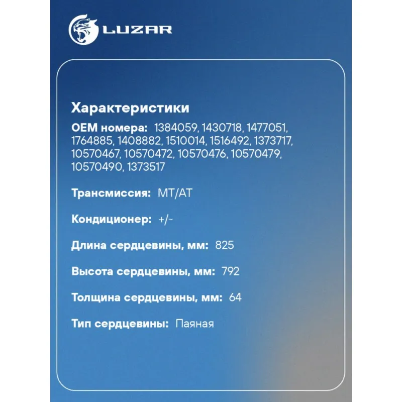 ОНВ (радиатор интеркулера) для автомобилей Scania 4-series (95-) Характеристики: Артикул: LRIC 2803 OEM номера: 1384059, 1430718, 1477051, 1764885, 1408882, 1510014, 1516492, 1373717, 10570467, 10570472, 10570476, 10570479, 10570490, 1373517 Трансмиссия: MT/AT Кондиционер: +/- Длина сердцевины, мм: 825 Высота сердцевины, мм: 792 Толщина сердцевины, мм: 64 Материал сердцевины: алюминий Тип сердцевины: паяная Подходит для авто: Scania 4-series (95-) Для проверки применяемости отправьте VIN автомобиля через вкладку "Есть вопросы о товаре?" Комплектация: Радиатор интеркулера Паспорт изделия Гарантия: от 1 года.