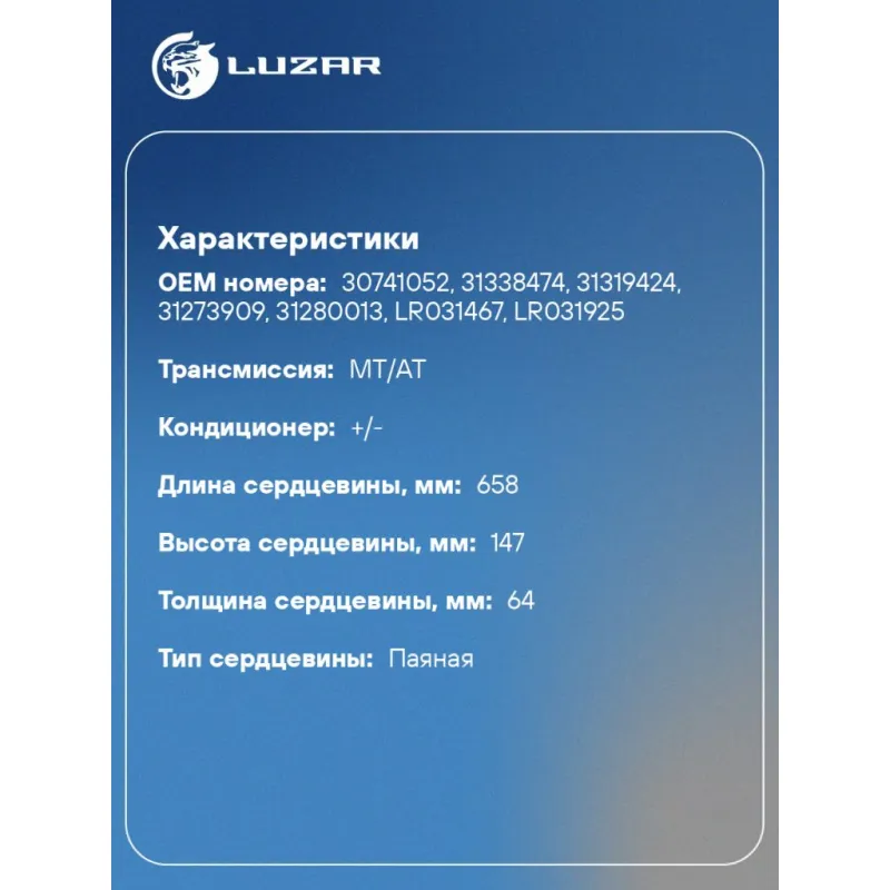 ОНВ (радиатор интеркулера) для автомобилей Volvo XC60 (08-)/XC70 (07-)/RR Evoque (11-) Характеристики: Артикул: LRIC 1009 OEM номера: 30741052, 31338474, 31319424, 31273909, 31280013, LR031467, LR031925 Трансмиссия: MT/AT Кондиционер: +/- Длина сердцевины, мм: 658 Высота сердцевины, мм: 147 Толщина сердцевины, мм: 64 Материал сердцевины: алюминий Материал бачков: пластик Тип сердцевины: паяная Сопутствующий товар: Радиаторы охлаждения: LRc 1041 Подходит для авто: Volvo XC60 (07-), V60 (10-), V40 (12-), S80 II (06-), XC60 (07-), XC70 (07-), V70 (07-), V60 (10-), S80 II (06-) Land Rover Discovery Sport (14-), Range Rover Evoque (11-), Freelander 2 (11-) Для проверки применяемости отправьте VIN автомобиля через вкладку "Есть вопросы о товаре?" Комплектация: Радиатор интеркулера Паспорт изделия Гарантия: от 1 года.