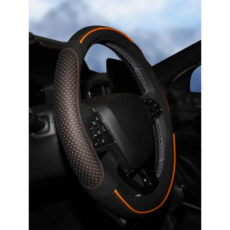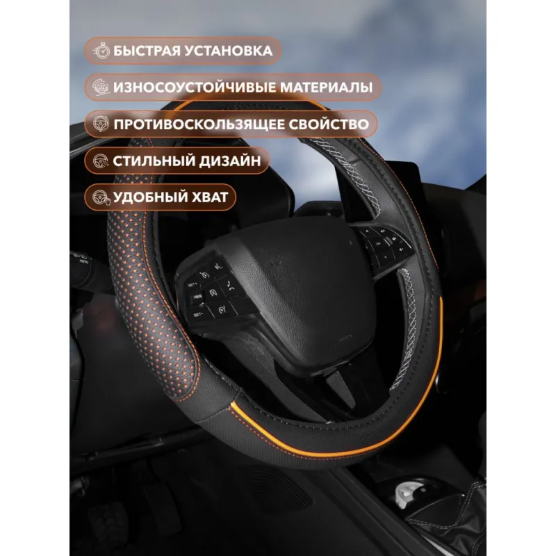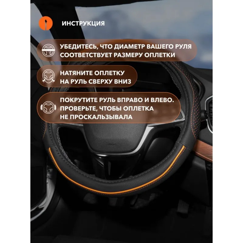 Оплетка на руль, искусст. кожа с перф., черная, оранж. прошивка, 38 см/М Описание: Универсальная оплетка на руль AWS-LI-21M бренда Airline — это отличный способ преобразить Ваш автомобиль и защитить руль от износа. Подходит для большинства моделей автомобилей и легко устанавливается на руль. Чехол на руль автомобиля обеспечивает хороший захват и комфортную поездку. Предотвращает скольжение рук и уменьшает усталость во время длительных поездок. Предназначены для защиты штатной обивки или покрытия руля от преждевременного износа и повреждений. А так же для более удобного хвата руля при вождении автомобиля. Преимущества: - состав: искусственная кожа/экокожа, ТЭП; - индивидуализирует интерьер авто; - удобный хват руля; - легкая установка; - защита покрытия руля от износа; - улучшение внешнего вида руля; - не имеет сильного неприятного запаха; - приятная на ощупь; - противоскользящее свойство; Инструкция: 1) Убедитесь, что диаметр вашего руля соответствует размеру оплетки M см; 2) Натяните оплетку на руль сверху вниз; 3) Прокрутите руль вправо/влево. Проверьте, чтобы оплетка не проскальзывала. Оплетка на руль автомобиля является необходимым аксессуаром для всех автомобилей. Оплетка на руль/чехол на руль - это отличный подарок автовладельцу/водителю любого возраста на 23 февраля, 8 марта, Новый год, мужчине, женщине, мужу, жене, парню, девушке. Преобразите салон с помощью такого аксессуара. Характеристики: Артикул: AWS-LI-21M Цвет прошивки: оранжевый Цвет: черный Диаметр, см: 38 Размер: M Форма рулевого колеса: круг Диаметр внутренний, мм: 34 Комплектация: Оплетка - 1 шт Гарантия: от 1 года.