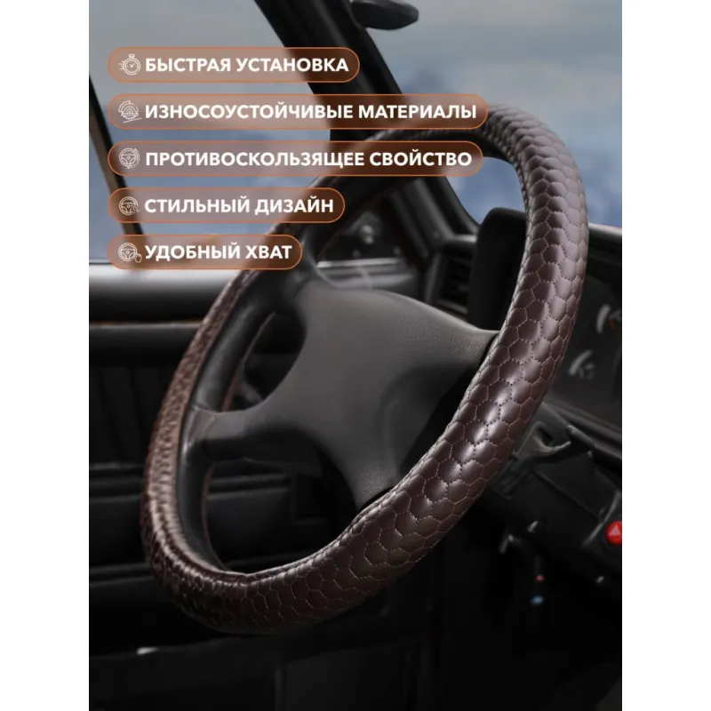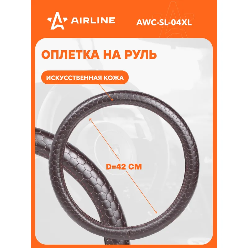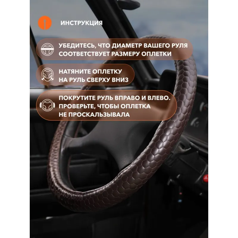 Оплетка на руль, искусственная кожа с тиснением, коричневая, 42 см / XL Описание: Универсальная оплетка на руль AWC-SL-04XL бренда Airline — это отличный способ преобразить Ваш автомобиль и защитить руль от износа. Подходит для большинства моделей автомобилей и легко устанавливается на руль. Чехол на руль автомобиля обеспечивает хороший захват и комфортную поездку. Предотвращает скольжение рук и уменьшает усталость во время длительных поездок. Предназначены для защиты штатной обивки или покрытия руля от преждевременного износа и повреждений. А так же для более удобного хвата руля при вождении автомобиля. Преимущества: - состав: искусственная кожа/экокожа, ТЭП; - индивидуализирует интерьер авто; - удобный хват руля; - легкая установка; - защита покрытия руля от износа; - улучшение внешнего вида руля; - не имеет сильного неприятного запаха; - приятная на ощупь; - противоскользящее свойство; Инструкция: 1) Убедитесь, что диаметр вашего руля соответствует размеру оплетки XL см; 2) Натяните оплетку на руль сверху вниз; 3) Прокрутите руль вправо/влево. Проверьте, чтобы оплетка не проскальзывала. Оплетка на руль автомобиля является необходимым аксессуаром для всех автомобилей. Оплетка на руль/чехол на руль - это отличный подарок автовладельцу/водителю любого возраста на 23 февраля, 8 марта, Новый год, мужчине, женщине, мужу, жене, парню, девушке. Преобразите салон с помощью такого аксессуара. Характеристики: Артикул: AWC-SL-04XL Цвет прошивки: коричневый Цвет: коричневый Диаметр, см: 42 Размер: XL Форма рулевого колеса: круг Диаметр внутренний, мм: 34 Комплектация: Оплетка - 1 шт Картонная вкладка - 1 шт Гарантия: от 1 года.