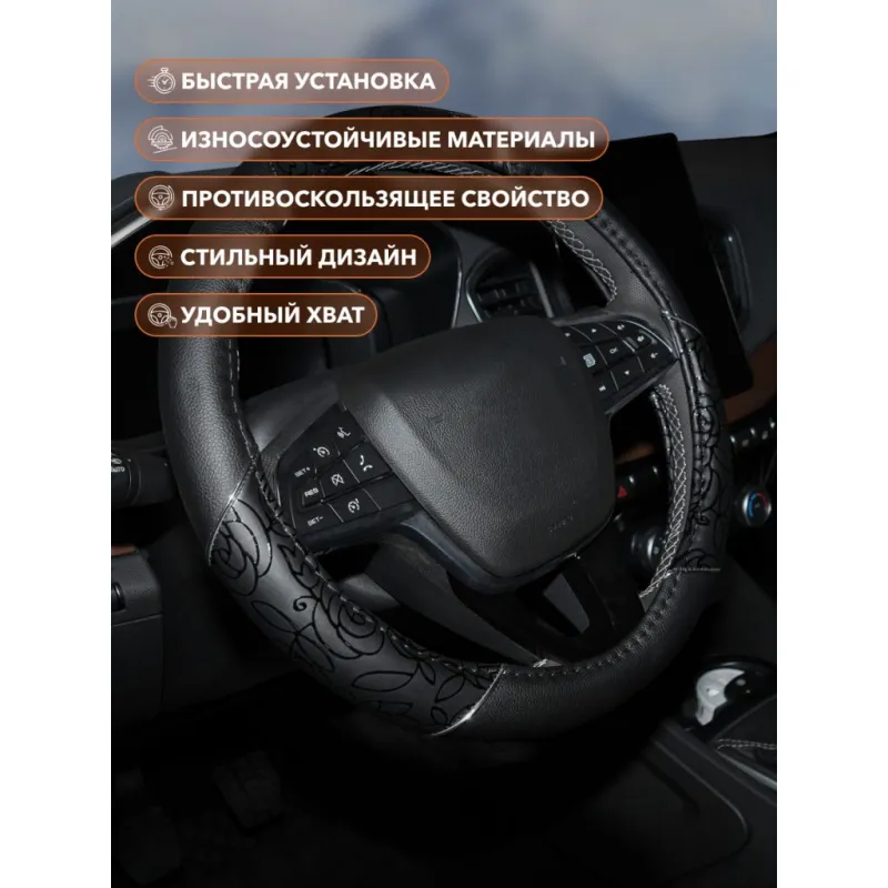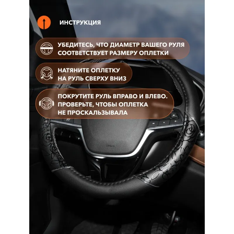 Оплетка на руль, искусственная кожа, женская модель, черная/принт, 38 см / M Описание: Универсальная оплетка на руль AWC-CM-06M бренда Airline — это отличный способ преобразить Ваш автомобиль и защитить руль от износа. Подходит для большинства моделей автомобилей и легко устанавливается на руль. Чехол на руль автомобиля обеспечивает хороший захват и комфортную поездку. Предотвращает скольжение рук и уменьшает усталость во время длительных поездок. Предназначены для защиты штатной обивки или покрытия руля от преждевременного износа и повреждений. А так же для более удобного хвата руля при вождении автомобиля. В комплекте идут полосы антискользящие с клеящим слоем для каждой боковой накладки. Преимущества: - состав: экокожа,ТЭП, износоустойчивые материалы; - индивидуализирует интерьер авто; - удобный хват руля; - легкая установка; - универсальный размер; - приятные на ощупь; - не имеют неприятного запаха; - противоскользящее свойство; Инструкция: 1) Убедитесь, что диаметр вашего руля соответствует размеру оплетки M см; 2) Натяните оплетку на руль сверху вниз; 3) Прокрутите руль вправо/влево. Проверьте, чтобы оплетка не проскальзывала. Оплетка на руль автомобиля является необходимым аксессуаром для всех автомобилей. Оплетка на руль/чехол на руль - это отличный подарок автовладельцу/водителю любого возраста на 23 февраля, 8 марта, Новый год, мужчине, женщине, мужу, жене, парню, девушке. Преобразите салон с помощью такого аксессуара. Характеристики: Артикул: AWC-CM-06M Цвет прошивки: черный Цвет: черный/принт Диаметр, см: 38 Размер: M Форма рулевого колеса: круг Диаметр внутренний, мм: 34 Комплектация: Оплетка - 1 шт Картонная вкладка - 1 шт Гарантия: от 1 года.