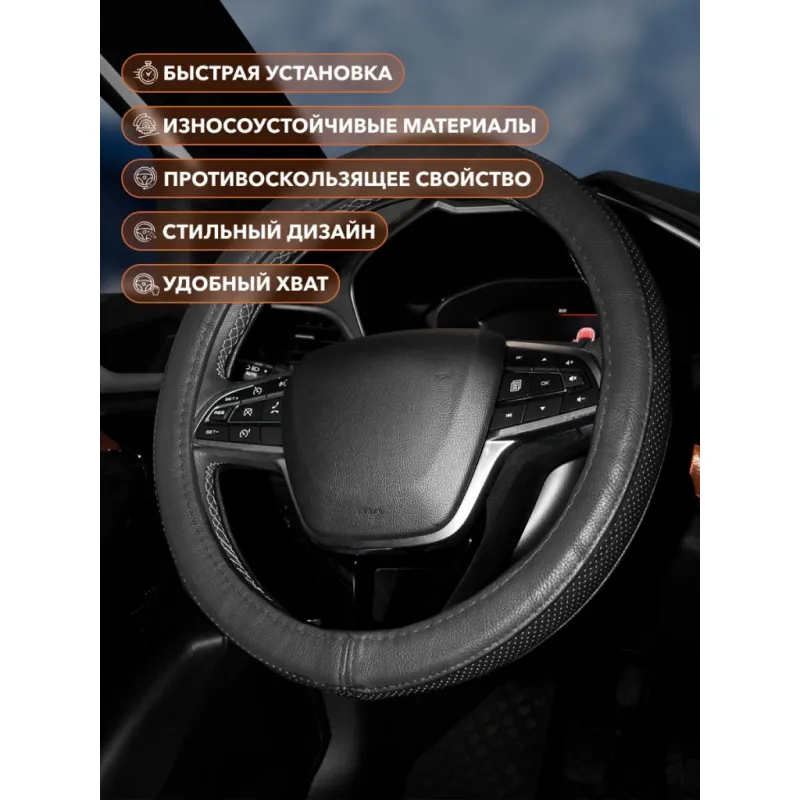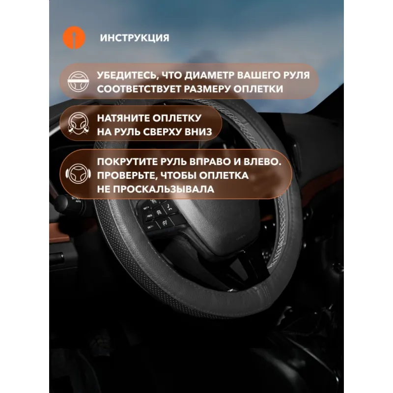 Оплетка на руль комбинированная, гладкая/рельфная кожа, черная, 37-39 см/М Описание: Универсальная оплетка на руль AWC-RS-14M бренда Airline — это отличный способ преобразить Ваш автомобиль и защитить руль от износа. Подходит для большинства моделей автомобилей и легко устанавливается на руль. Чехол на руль автомобиля обеспечивает хороший захват и комфортную поездку. Предотвращает скольжение рук и уменьшает усталость во время длительных поездок. Предназначены для защиты штатной обивки или покрытия руля от преждевременного износа и повреждений. А так же для более удобного хвата руля при вождении автомобиля. Преимущества: - состав: кожа рециклированная, резина; - индивидуализирует интерьер авто; - удобный хват руля; - легкая установка; - защита покрытия руля от износа; - улучшение внешнего вида руля; - морозостойкие материалы; - не имеет сильного неприятного запаха; - гладкая поверхность с одношовным соединением; - современный аналог натуральной кожи(99%); - приятная на ощупь; - противоскользящее свойство; Инструкция: 1) Убедитесь, что диаметр вашего руля соответствует размеру оплетки М см; 2) Натяните оплетку на руль сверху вниз; 3) Прокрутите руль вправо/влево. Проверьте, чтобы оплетка не проскальзывала. Оплетка на руль автомобиля является необходимым аксессуаром для всех автомобилей. Оплетка на руль/чехол на руль - это отличный подарок автовладельцу/водителю любого возраста на 23 февраля, 8 марта, Новый год, мужчине, женщине, мужу, жене, парню, девушке. Преобразите салон с помощью такого аксессуара. Характеристики: Артикул: AWC-RS-14M Цвет прошивки: черный Цвет: черный Диаметр, см: 38 Размер: М Форма рулевого колеса: круг Диаметр внутренний, мм: 34 Комплектация: Оплетка - 1 шт ПЭ пакет - 1 шт Картонный подвес - 1 шт Гарантия: от 1 года.