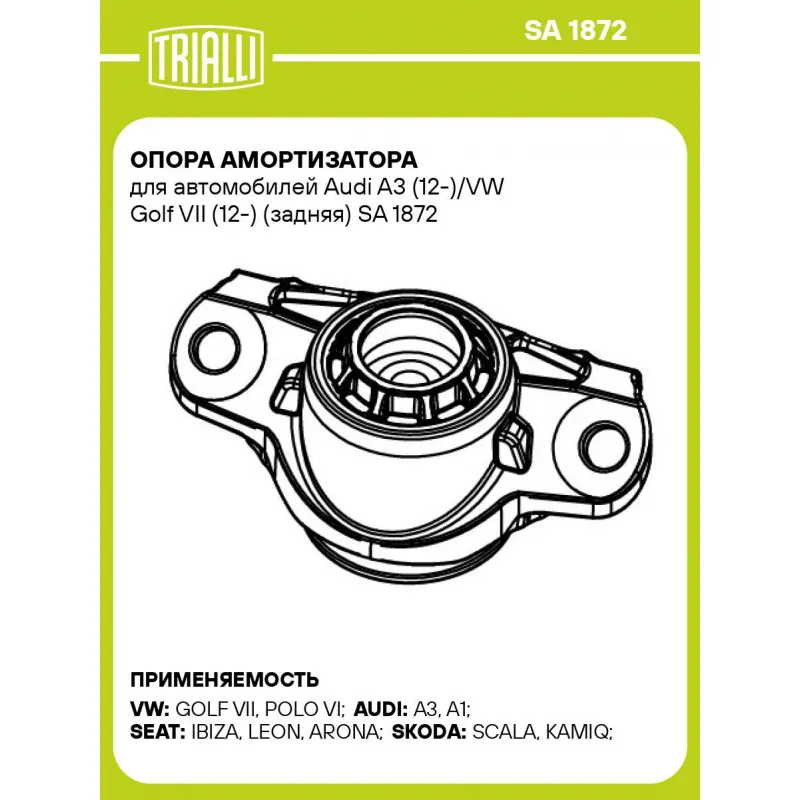 Опора амортизатора для автомобилей Audi A3 (12-)/VW Golf VII (12-) (задняя) Характеристики: Артикул: SA 1872 OEM номера: 5Q0513353H, N90648402 Материал: Резина/металл Ось (сторона установки): Сзади, слева/справа Гарантийный срок: 2 года/60 000 км Товарная линейка: BLACK Количество на автомобиль: 2 Дополнительная информация: Упак... Читать полностью →