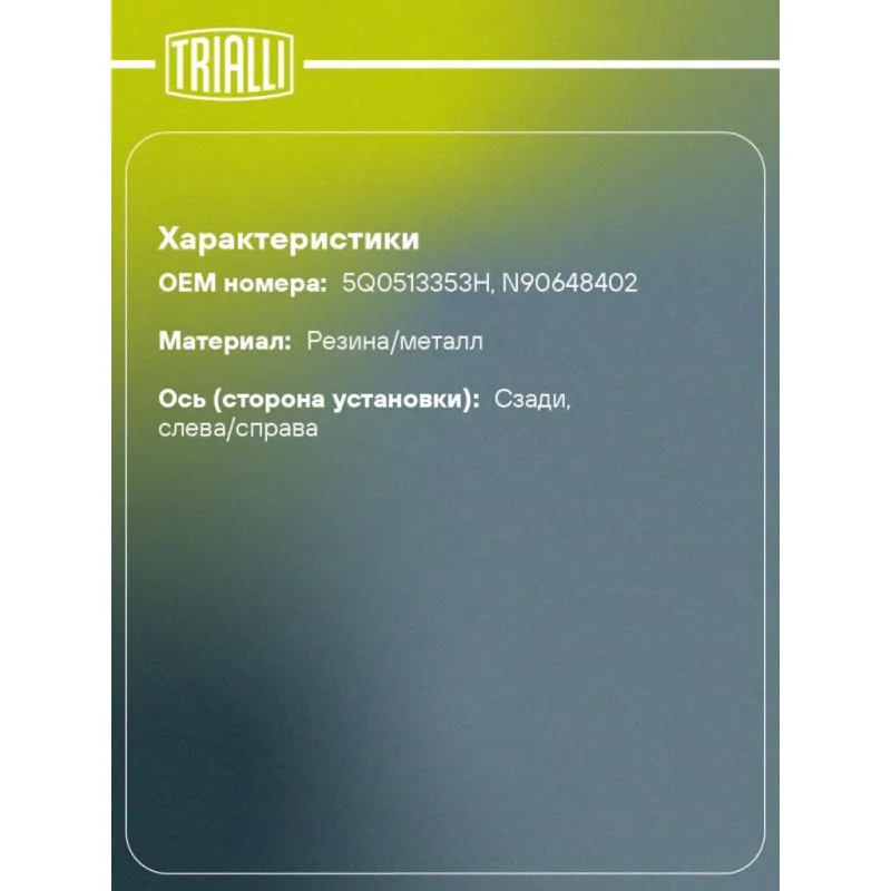 Опора амортизатора для автомобилей Audi A3 (12-)/VW Golf VII (12-) (задняя) Характеристики: Артикул: SA 1872 OEM номера: 5Q0513353H, N90648402 Материал: Резина/металл Ось (сторона установки): Сзади, слева/справа Гарантийный срок: 2 года/60 000 км Товарная линейка: BLACK Количество на автомобиль: 2 Дополнительная информация: Упаковка изделия может отличаться от представленной на фото Комплектация: Опора амортизатора - 1 шт Болт - 2 шт Шайба - 4 шт Гарантия: от 1 года.