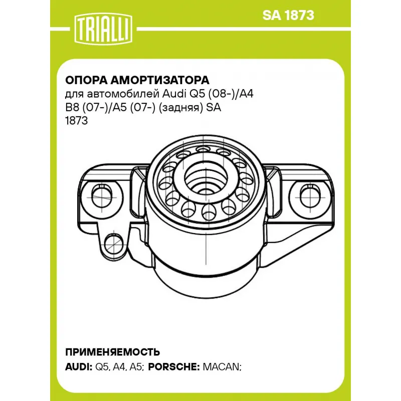 Опора амортизатора для автомобилей Audi Q5 (08-)/A4 B8 (07-)/A5 (07-) (задняя) Характеристики: Артикул: SA 1873 OEM номера: 8K0513353E, 8K0513353F Материал: Резина/металл Ось (сторона установки): Сзади, слева/справа Гарантийный срок: 2 года/60 000 км Товарная линейка: BLACK Количество на автомобиль: 2 Дополнительная информация: ... Читать полностью →