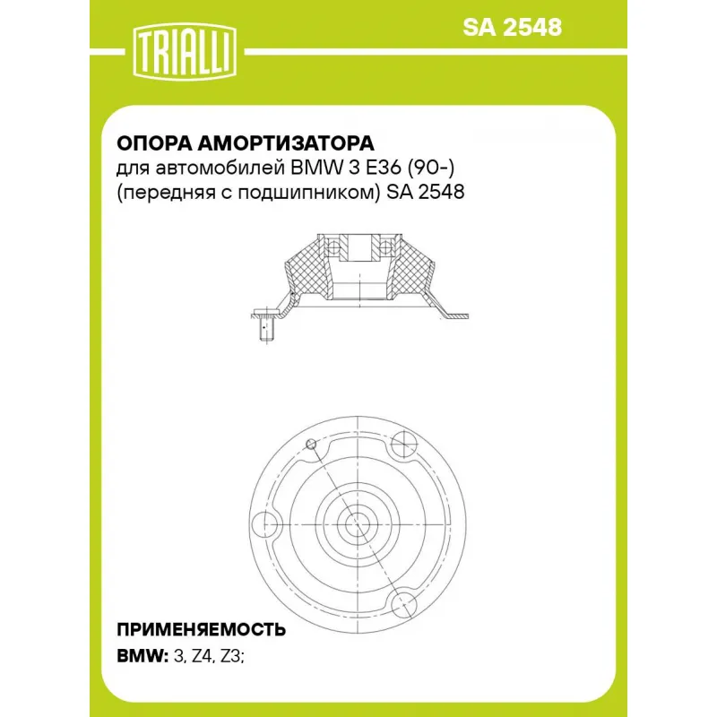 Опора амортизатора для автомобилей BMW 3 E36 (90-) (передняя с подшипником) Характеристики: Артикул: SA 2548 OEM номера: 31331135582, 31336769585, 31331092885, 31336764947, 31336779613, 31331090467 Материал: Резина/металл Ось (сторона установки): Спереди, слева/справа Гарантийный срок: 2 года/60 000 км Товарная линейка: BLACK Количество на автомобиль: 2 Дополнительная информация: Упаковка изделия может отличаться от представленной на фото Комплектация: Опора амортизационной стойки в сборе с подшипником - 1 шт Гарантия: от 1 года.