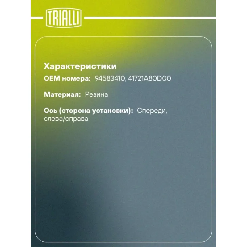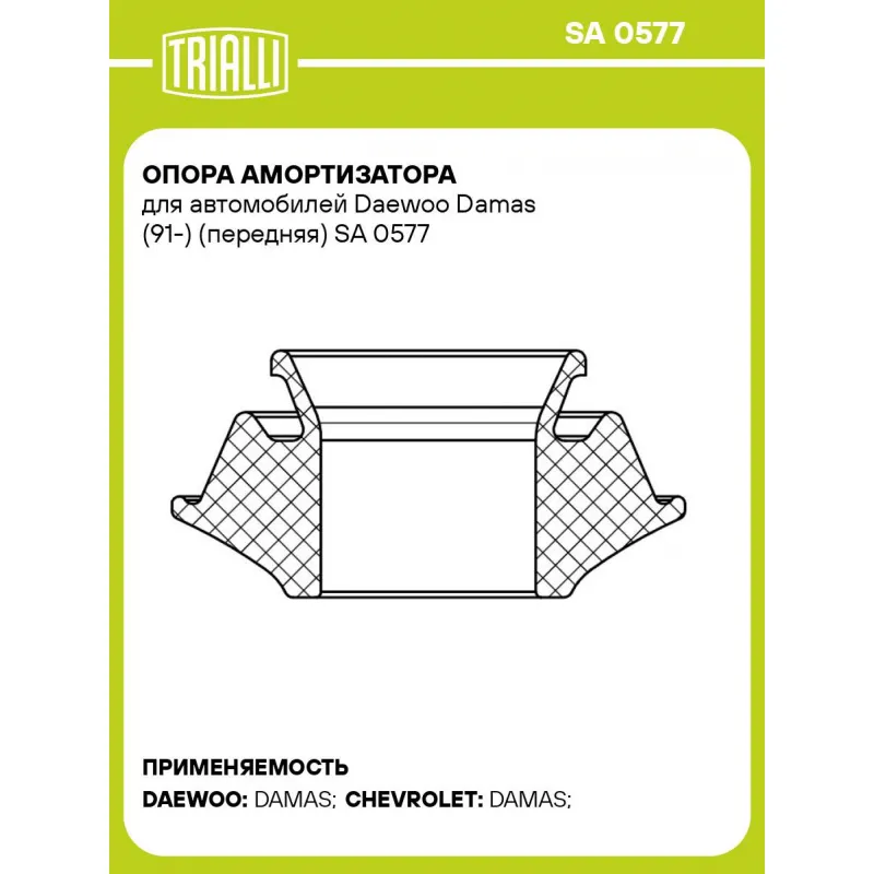 Опора амортизатора для автомобилей Daewoo Damas (91-) (передняя) Характеристики: Артикул: SA 0577 OEM номера: 94583410, 41721A80D00 Материал: Резина Ось (сторона установки): Спереди, слева/справа Гарантийный срок: 2 года/60 000 км Товарная линейка: BLACK Количество на автомобиль: 2 Дополнительная информация: Упаковка изделия может отличаться от представленной на фото Комплектация: Резиновая подушка (втулка амортизационной опоры) - 1 шт Гарантия: от 1 года.