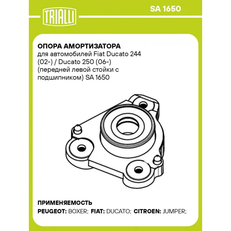 Опора амортизатора для автомобилей Fiat Ducato 244 (02-) / Ducato 250 (06-) (передней левой стойки с подшипником) Характеристики: Артикул: SA 1650 OEM номера: 1350789080, 9405031789, 1318573080, 1342879080, 1355179080, 1318572080, 1607691280, 1320987080, 1329774080, 1338762080, 1339629080, 1345897080, 1357705080, 5031.78, 5038.29, 5038.E3, 5038.F3, 5038.87, 5038.A4, 503550, 503555, 5038000, 5038000000000, 503868, 503547, 5035.30, 5035.39, 5035.56, 1610531680, 1620298580, 5031F4 Материал: Резина/металл Ось (сторона установки): Спереди, слева/справа Гарантийный срок: 2 года/60 000 км Товарная линейка: BLACK Парный товар: SA 1652 Количество на автомобиль: 1 Дополнительная информация: Упаковка изделия может отличаться от представленной на фото Комплектация: Опора амортизационной стойки - 1 шт Подшипник - 1 шт Уплотнительное кольцо - 1 шт Болт - 3 шт Гарантия: от 1 года.