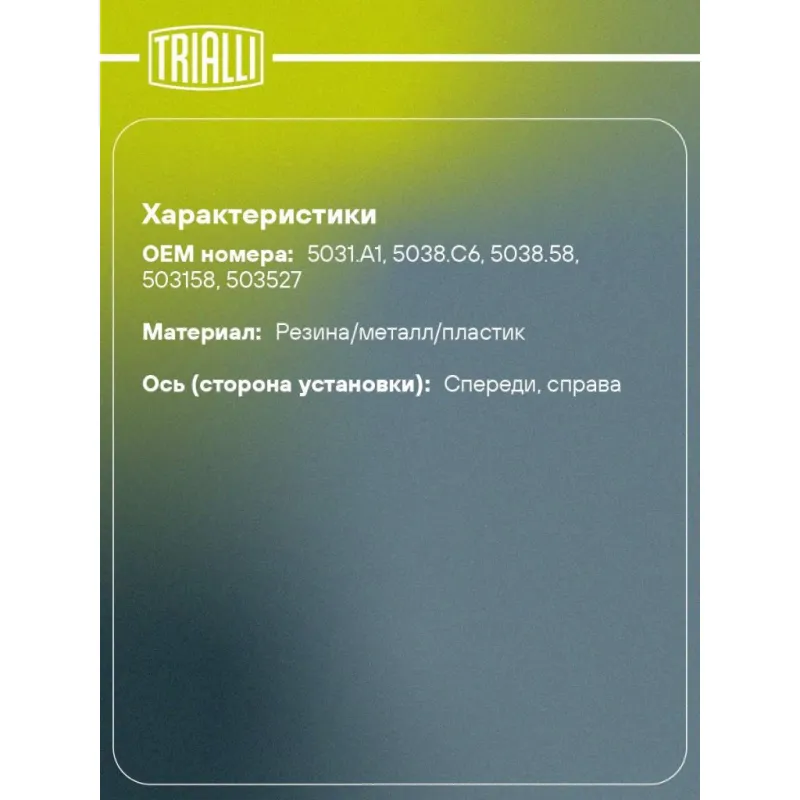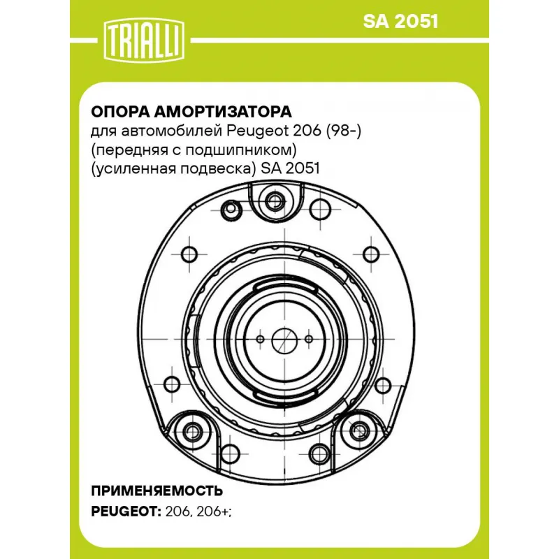 Опора амортизатора для автомобилей Peugeot 206 (98-) (передняя правая с подшипником) (усиленная подвеска) Характеристики: Артикул: SA 2051 OEM номера: 5031.A1, 5038.C6, 5038.58, 503158, 503527 Материал: Резина/металл/пластик Ось (сторона установки): Спереди, справа Гарантийный срок: 2 года/60 000 км Товарная линейка: BLACK Парный товар: SA 2050 Количество на автомобиль: 1 Дополнительная информация: Упаковка изделия может отличаться от представленной на фото Комплектация: Опора амортизационной стойки - 1 шт Подшипник - 1 шт Гарантия: от 1 года.
