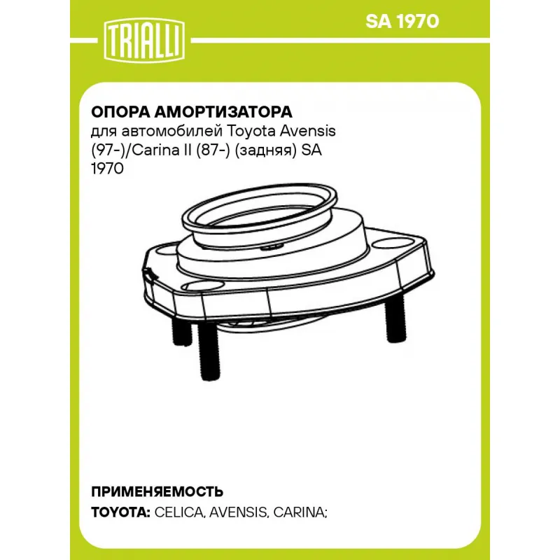 Опора амортизатора для автомобилей Toyota Avensis (97-)/Carina II (87-) (задняя) Характеристики: Артикул: SA 1970 OEM номера: 4807120140, 4807220041, 4875005020, 4875020050, 4807120151, 4807220040, 4807220061, 4807120080, 4875005030, 4807120141, 4807220020, 4875021020 Материал: Резина/металл Ось (сторона установки): Сзади, слева/справа Гарантийный срок: 2 года/60 000 км Товарная линейка: BLACK Количество на автомобиль: 2 Дополнительная информация: Упаковка изделия может отличаться от представленной на фото Комплектация: Опора амортизатора - 1 шт Гарантия: от 1 года.