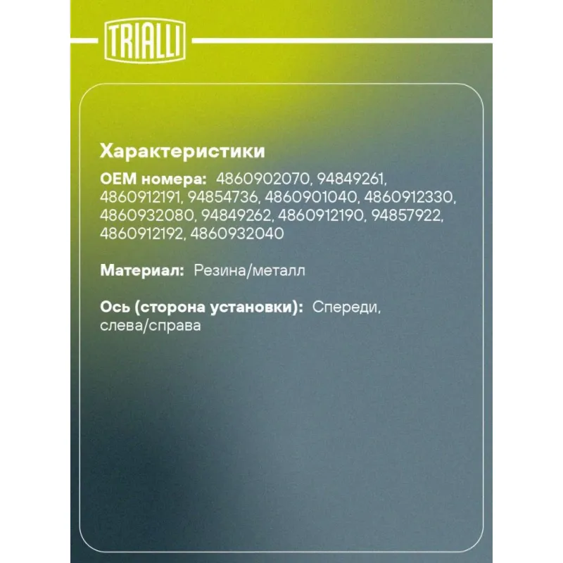 Опора амортизатора для автомобилей Toyota Corolla E90 (87-) (передняя с подшипником) Характеристики: Артикул: SA 1940 OEM номера: 4860902070, 94849261, 4860912191, 94854736, 4860901040, 4860912330, 4860932080, 94849262, 4860912190, 94857922, 4860912192, 4860932040 Материал: Резина/металл Ось (сторона установки): Спереди, слева/справа Гарантийный срок: 2 года/60 000 км Товарная линейка: BLACK Количество на автомобиль: 2 Дополнительная информация: Упаковка изделия может отличаться от представленной на фото Комплектация: Опора амортизационной стойки в сборе с подшипником - 1 шт Гарантия: от 1 года.