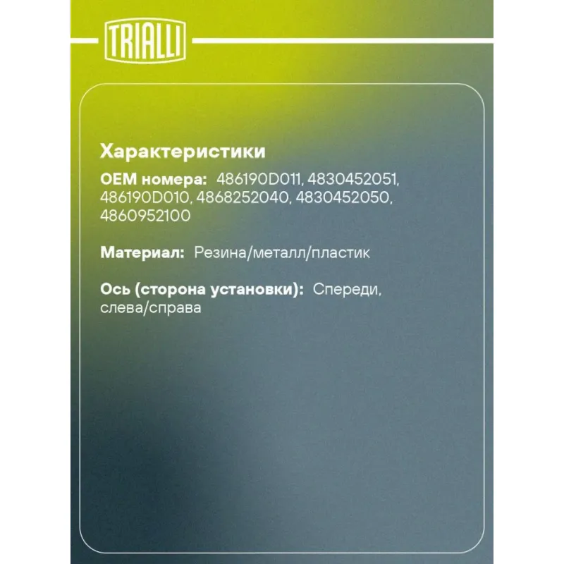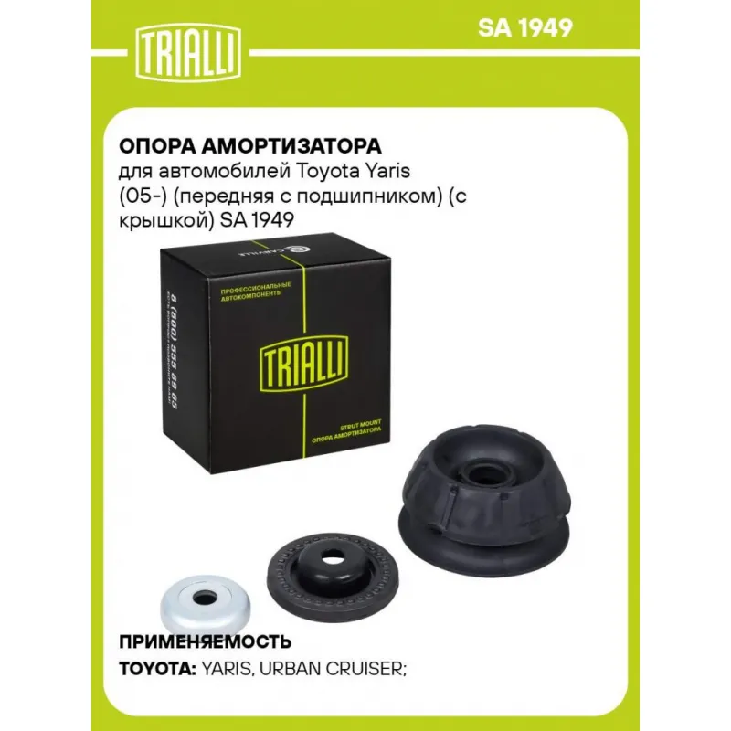 Опора амортизатора для автомобилей Toyota Yaris (05-) (передняя с подшипником) (с крышкой) Характеристики: Артикул: SA 1949 OEM номера: 486190D011, 4830452051, 486190D010, 4868252040, 4830452050, 4860952100 Материал: Резина/металл/пластик Ось (сторона установки): Спереди, слева/справа Гарантийный срок: 2 года/60 000 км Товарная линейка: BLACK Количество на автомобиль: 2 Дополнительная информация: Упаковка изделия может отличаться от представленной на фото Комплектация: Подшипник - 1 шт Опора амортизационной стойки - 1 шт Металлическая крышка - 1 шт Гарантия: от 1 года.
