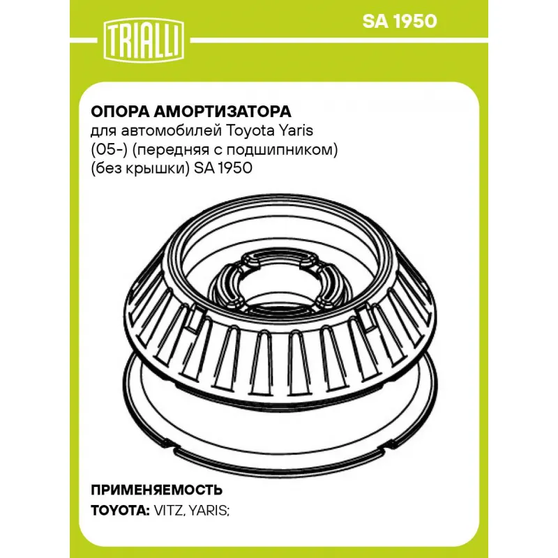 Опора амортизатора для автомобилей Toyota Yaris (05-) (передняя с подшипником) (без крышки) Характеристики: Артикул: SA 1950 OEM номера: 4861952040, 486090D040 Материал: Резина/металл/пластик Ось (сторона установки): Спереди, слева/справа Гарантийный срок: 2 года/60 000 км Товарная линейка: BLACK Количество на автомобиль: 2 Дополнительная информация: Упаковка изделия может отличаться от представленной на фото Комплектация: Опора амортизационной стойки - 1 шт Подшипник - 1 шт Гарантия: от 1 года.