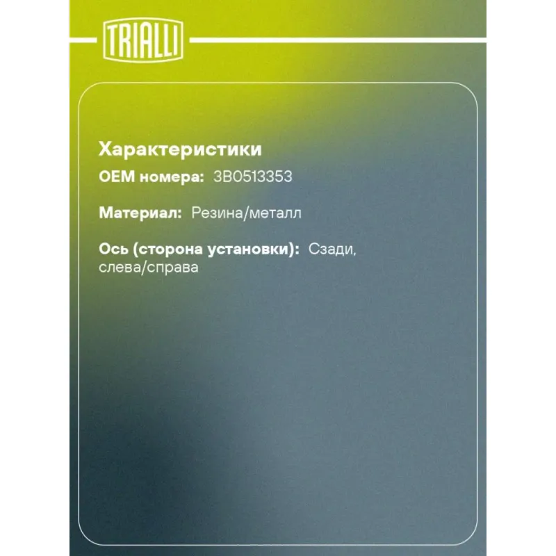 Опора амортизатора для автомобилей VW Passat B5 (96-)/Skoda Superb I (01-) (задняя) Характеристики: Артикул: SA 1874 OEM номера: 3B0513353 Материал: Резина/металл Ось (сторона установки): Сзади, слева/справа Гарантийный срок: 2 года/60 000 км Товарная линейка: BLACK Количество на автомобиль: 2 Дополнительная информация: Упаковка... Читать полностью →
