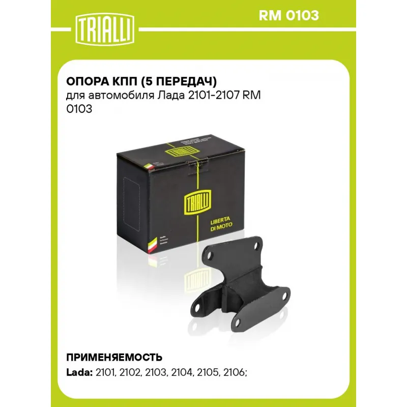 Опора КПП (5 передач) для автомобиля Лада 2101-2107 Характеристики: Артикул: RM 0103 OEM номера: 2107-1001045, 21070-1001045-00 Гарантийный срок: 2 года/60 тыс. Товарная линейка: BLACK Количество на автомобиль: 1 Материал: Резина/Металл Подходит для авто: ВАЗ 2101, 2101, 2102, 2102, 2103, 2103, 2104, 2105, 2105, 2106, 2106, 2107, 2104, 2105, 2107 Для проверки применяемости отправьте VIN автомобиля через вкладку "Есть вопросы о товаре?" Комплектация: Опора КПП - 1 шт Гарантия: от 1 года.