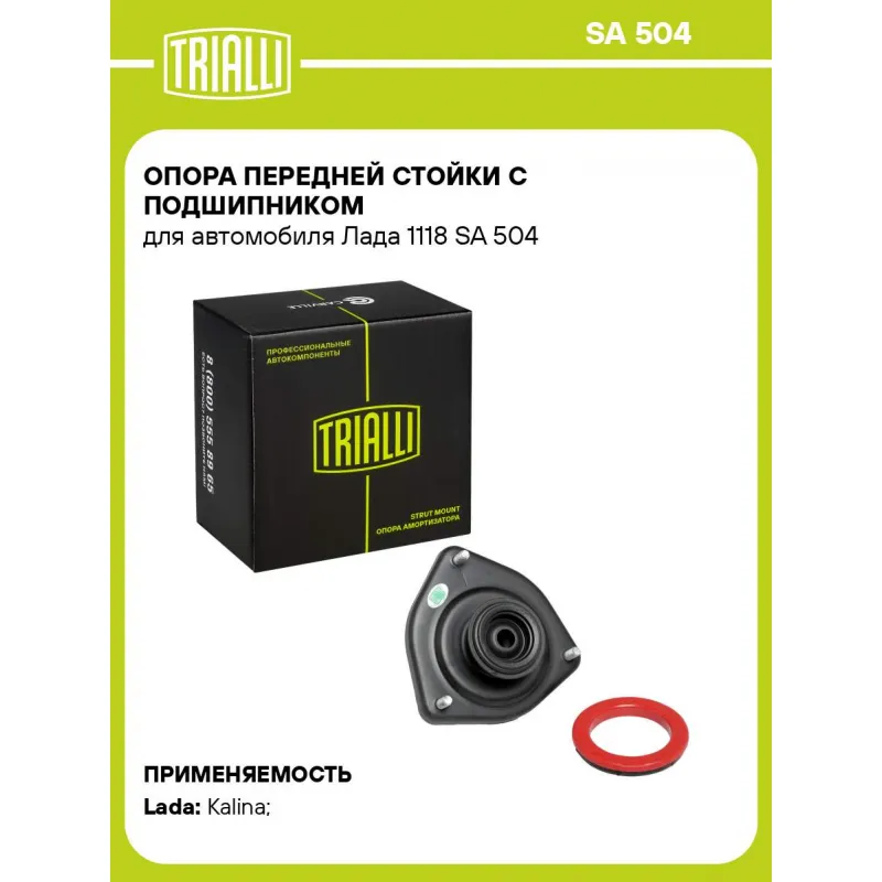 Опора передней стойки c подшипником для автомобиля Лада 1118 Описание: Опора передней стойки с подшипником (амортизационная стойка) SA 504 бренда TRIALLI - применяется в подвеске автомобиля, входят в состав передней амортизационной стойки и обеспечивают её крепление к кузову автомобиля, изолируют кузов от вибраций, передаваемых от подвески автомобиля, и обеспечивают поворот передних колёс. Особенности SA 504: - Ось (сторона установки) - Спереди, слева/справа; - Сопутствующий товар: Амортизаторы: ; - Применяемость: LADA KALINA..Подбор по VIN-номеру вашего автомобиля - через кнопку 'Задать вопрос'. Специалист проверит применяемость и ответит вам. Преимущества: - Инновационная технология производства; - Контроль качества: - Дополнительная проверка с помощью 3D модели; - Проверка каждой позиции по чертежам; - Высокоэффективная система проектирования; Опора стойки в автомобиль состоит из металлического (стального) корпуса, резиновой проставки и подшипника металлического или металлопластикового. Подшипник представляет собой подшипник скольжения пластиковый - два пластмассовых диска, обеспечивающих скольжение друг относительно друга, или подшипник скольжения металлический - два металлических диска, разделенных пластмассовой вставкой. В нашем магазине, вы найдете широкий ассортимент высококачественных авто запчастей, ремонтные комплекты, опоры переднего/заднего амортизатора в машину, амортизаторы для автомобиля задние/передние. Характеристики: Артикул: SA 504 OEM номера: 1118-2902821, 1118-2902840, 11180-2902821-00, 11180-2902840-00, 1118-2902821-85, 11180-2902821-85, 11180-2902821-03, 1118-2902821-03 Товарная линейка: BLACK Количество на автомобиль: 2 Материал: Резина/металл/пластик Ось (сторона установки): Спереди, слева/справа Гарантийный срок: 2 года/60 000 км Дополнительная информация: Упаковка изделия может отличаться от представленной на фото Подходит для авто: ВАЗ Kalina (04-) Для проверки применяемости отправьте VIN автомобиля через вкладку "Есть вопросы о товаре?" Комплектация: Опора амортизационной стойки - 1 шт Подшипник опорный - 1 шт Гарантия: от 1 года.
