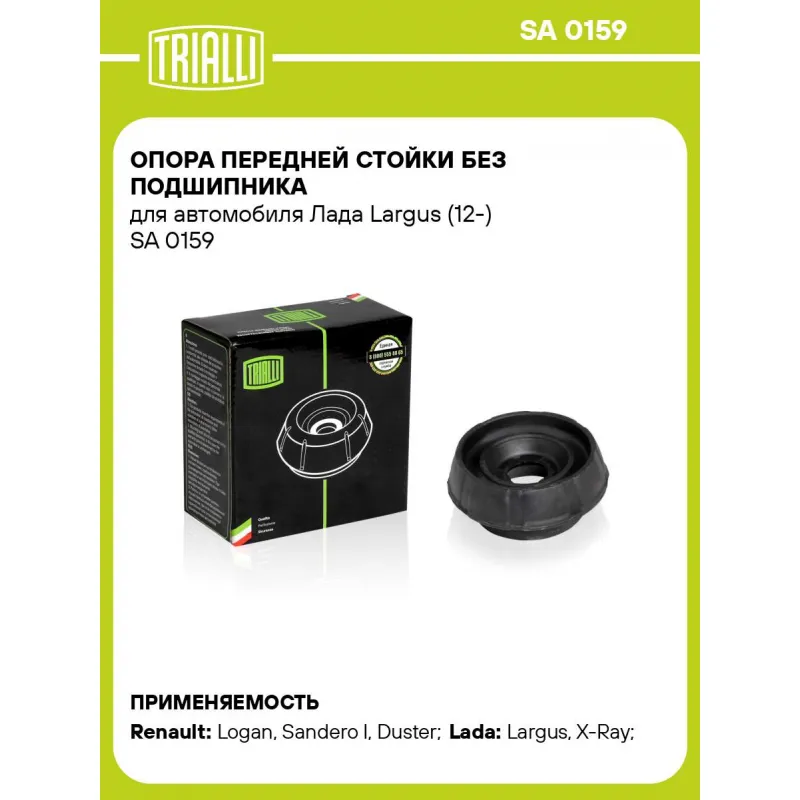 Опора передней стойки без подшипника для автомобиля Лада Largus (12-) Характеристики: Артикул: SA 0159 OEM номера: 6001547499, 543А06915R, 543204148R, 8200757150, 8200723741 Товарная линейка: BLACK Количество на автомобиль: 2 Материал: Резина/металл Ось (сторона установки): Спереди, слева/справа Сопутствующий товар: Амортизаторы: AG 09051; AG 09052; AG 09053; AG 09058; AG 09059; AG 09066; AG 09067; AG 09501; AG 09503; AG 09504; AG 09509; AG 09510; AG 09511; AG 09522; AH 09051 Гарантийный срок: 2 года/60 000 км Дополнительная информация: Упаковка изделия может отличаться от представленной на фото Подходит для авто: Renault Logan (04-), Sandero I (09-), Duster (10-), Sandero II (14-), Logan (04-), Logan (08-), Duster (10-), Logan II (12-), Sandero II (14-) ВАЗ Largus (12-), X-Ray (15-) Для проверки применяемости отправьте VIN автомобиля через вкладку "Есть вопросы о товаре?" Комплектация: Опора амортизационной стойки - 1 шт Гарантийный талон - 1 шт Гарантия: от 1 года.