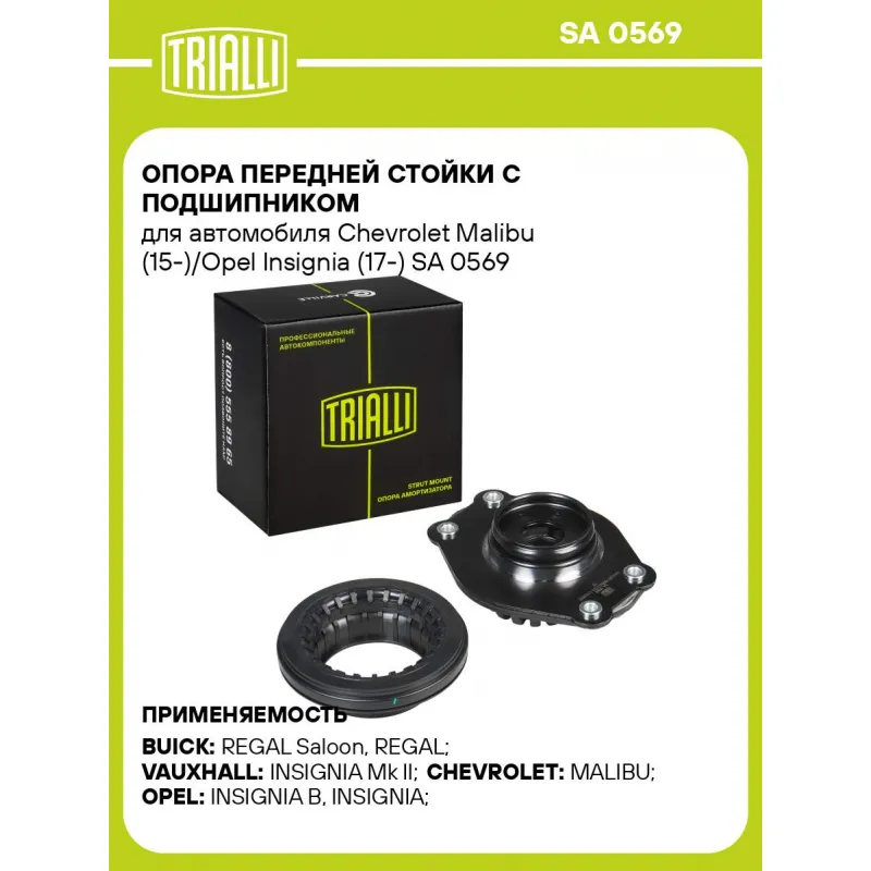 Опора передней стойки с подшипником для автомобиля Chevrolet Malibu (15-)/Opel Insignia (17-) Характеристики: Артикул: SA 0569 OEM номера: YR00070280, 84574474, 84449978, 23335486, 84056864 Материал: Резина/металл/пластик Ось (сторона установки): Спереди, слева/справа Гарантийный срок: 2 года/60 000 км Товарная линейка: BLACK Количество на автомобиль: 2 Дополнительная информация: Упаковка изделия может отличаться от представленной на фото Комплектация: Подшипник - 1 шт Опора амортизационной стойки - 1 шт Гарантия: от 1 года.