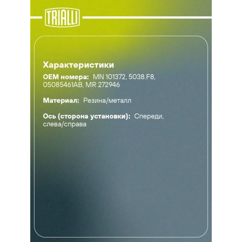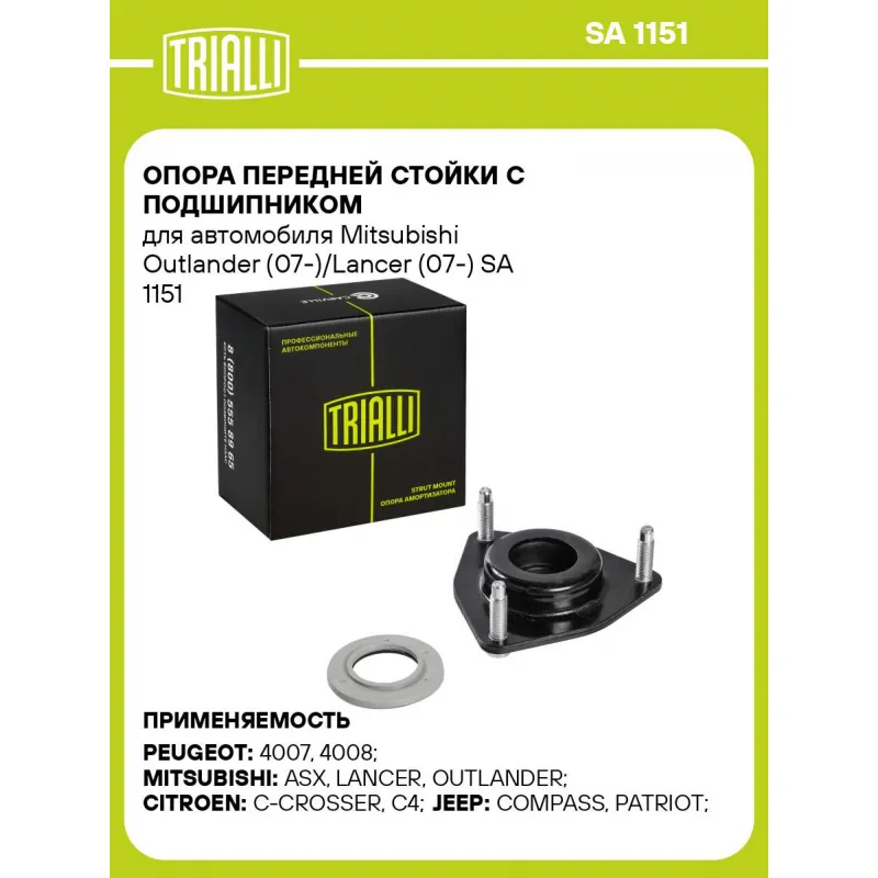 Опора передней стойки с подшипником для автомобиля Mitsubishi Outlander (07-)/Lancer (07-) Описание: Опора передней стойки с подшипником (амортизационная стойка) SA 1151 бренда TRIALLI - применяется в подвеске автомобиля, входят в состав передней амортизационной стойки и обеспечивают её крепление к кузову автомобиля, изолируют кузов от вибраций, передаваемых от подвески автомобиля, и обеспечивают поворот передних колёс. Особенности SA 1151: - Ось (сторона установки) - Спереди, слева/справа; - Сопутствующий товар: Амортизаторы: AG 11151; AG 11153; AG 11160; AG 11352; AG 11354; AG 11361; AG 11502; AG 11503; AG 11513; - Применяемость: CITROEN C-CROSSER, C4 AIRCROSS, DODGE CALIBER, JEEP COMPASS, PATRIOT, MITSUBISHI ASX, LANCER, OUTLANDER, PEUGEOT 4007, 4008..Подбор по VIN-номеру вашего автомобиля - через кнопку 'Задать вопрос'. Специалист проверит применяемость и ответит вам. Преимущества: - Инновационная технология производства; - Контроль качества: - Дополнительная проверка с помощью 3D модели; - Проверка каждой позиции по чертежам; - Высокоэффективная система проектирования; Опора стойки в автомобиль состоит из металлического (стального) корпуса, резиновой проставки и подшипника металлического или металлопластикового. Подшипник представляет собой подшипник скольжения пластиковый - два пластмассовых диска, обеспечивающих скольжение друг относительно друга, или подшипник скольжения металлический - два металлических диска, разделенных пластмассовой вставкой. В нашем магазине, вы найдете широкий ассортимент высококачественных авто запчастей, ремонтные комплекты, опоры переднего/заднего амортизатора в машину, амортизаторы для автомобиля задние/передние. Характеристики: Артикул: SA 1151 OEM номера: MN 101372, 5038.F8, 05085461AB, MR 272946 Товарная линейка: BLACK Количество на автомобиль: 2 Материал: Резина/металл Ось (сторона установки): Спереди, слева/справа Сопутствующий товар: Амортизаторы: AG 11151; AG 11153; AG 11160; AG 11352; AG 11354; AG 11361; AG 11502; AG 11503; AG 11513 Гарантийный срок: 2 года/60 000 км Дополнительная информация: Упаковка изделия может отличаться от представленной на фото Комплектация: Опора амортизационной стойки - 1 шт Подшипник - 1 шт Гарантийный талон - 1 шт Гарантия: от 1 года.