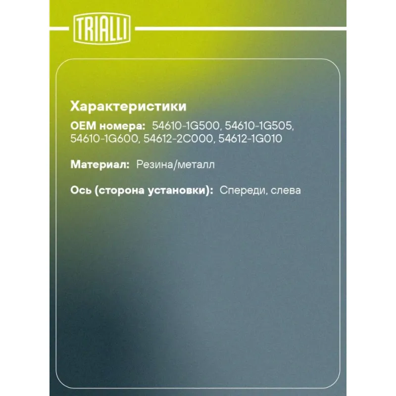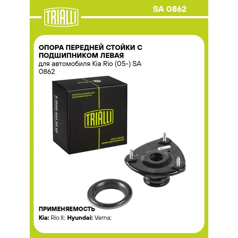 Опора передней стойки с подшипником левая для автомобиля Kia Rio (05-) Характеристики: Артикул: SA 0862 OEM номера: 54610-1G500, 54610-1G505, 54610-1G600, 54612-2C000, 54612-1G010 Товарная линейка: BLACK Парный товар: SA 0863 Количество на автомобиль: 1 Материал: Резина/металл Ось (сторона установки): Спереди, слева Сопутствующий товар: Амортизаторы: AG 08171; AG 08372; AG 08514; AG 08531 Гарантийный срок: 2 года/60 000 км Дополнительная информация: Упаковка изделия может отличаться от представленной на фото Подходит для авто: Kia Rio II (05-) Hyundai Verna (06-) Для проверки применяемости отправьте VIN автомобиля через вкладку "Есть вопросы о товаре?" Комплектация: Гарантийный талон - 1 шт Подшипник - 1 шт Опора амортизационной стойки - 1 шт Гарантия: от 1 года.