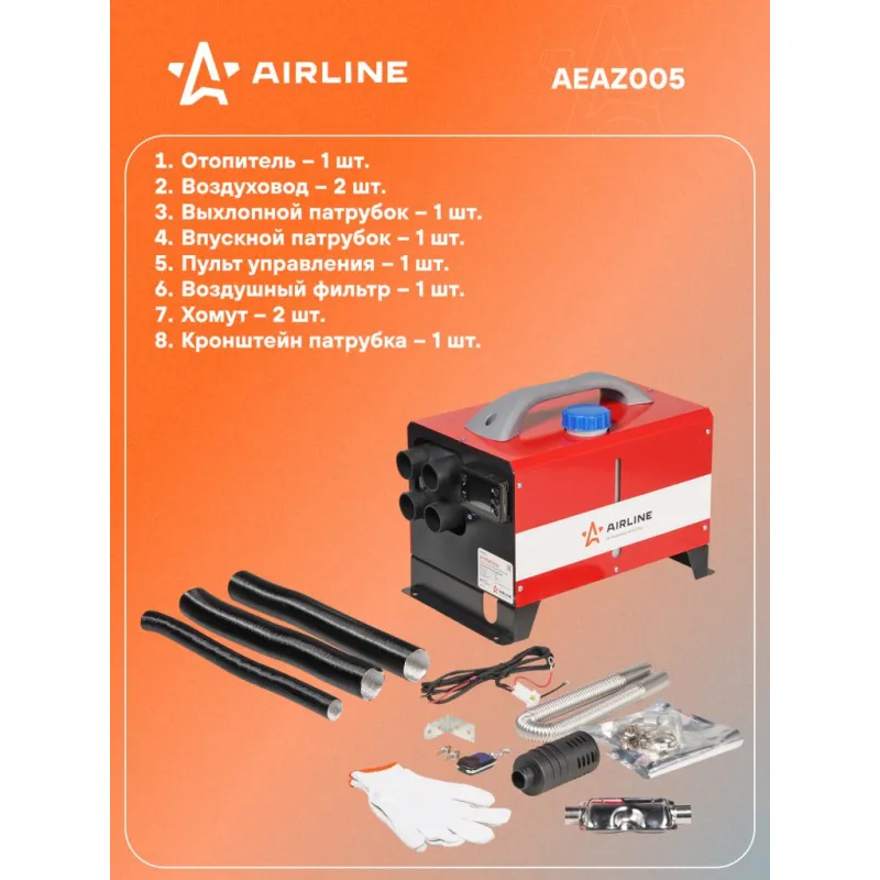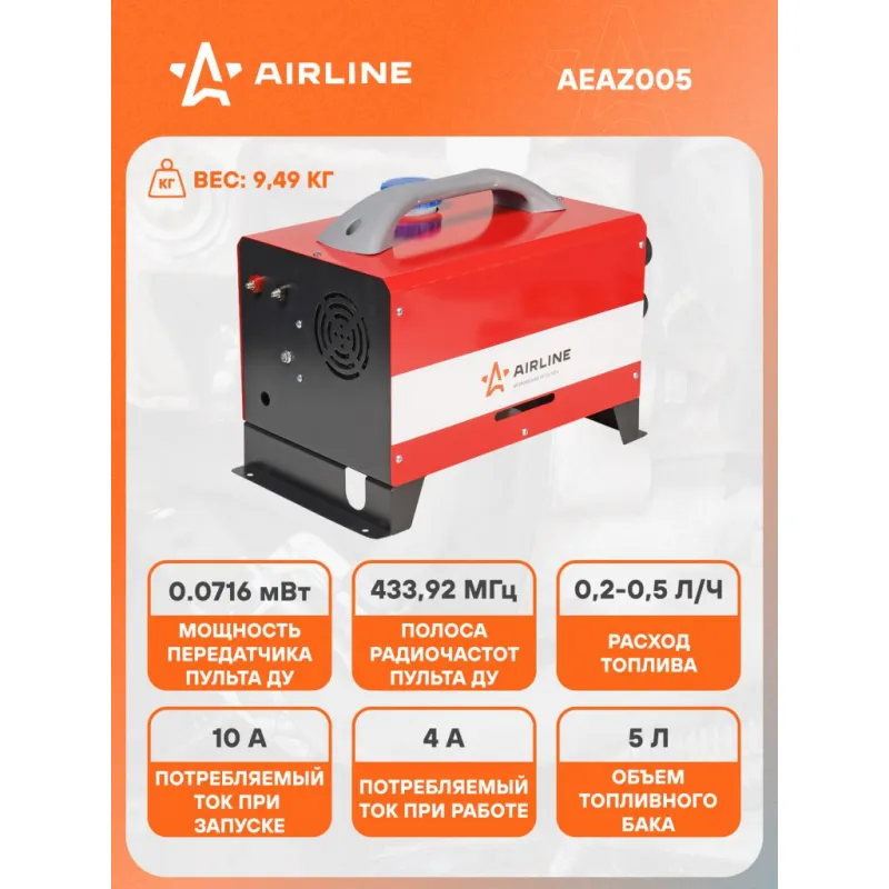 Отопитель воздушный автономный переносной 12В 5000Вт дизель металл. корпус (квадратный) Описание: Автономный дизельный воздушный отопитель 12 В 5000 Вт AIRLINE AEAZ005 работает на дизельном топливе и обеспечивает нагрев воздуха в кабине или салоне автомобиля/катера/спецтехники. Забор воздуха для горения и выхлоп отработанных газов производится с улицы. Отопители предназначены: * для обогрева рабочего места; * для обогрева различных помещений ограниченного объема транспортных средств и маломерных судов; * для поддержания комфортной температуры в помещении в течении длительного времени. Автоматическое выключение отопителя происходит: * при перегреве теплообменника нагревателя; * при превышении температуры нагретого воздуха; * при падении напряжения ниже 10В или его повышении свыше 16В; Запрещается использовать в непроветриваемых помещениях. Отопитель может быть смонтирован как внутри, так и снаружи транспортного средства. В случае монтажа снаружи транспортного средства, место монтажа должно быть защищено от неблагоприятных факторов (вода, снег, грязь) при помощи защитного кожуха. Руководство по монтажу и эксплуатации в комплекте. Товар официального производителя AIRLINE. Характеристики: Артикул: AEAZ005 Мощность, Вт: 5000 Напряжение питания, В: 12 Мощность передатчика пульта ДУ, мВт: 0.0716 Объём топливного бака, л: 5 Полоса радиочастот пульта ДУ, МГц: 433.92 Потребляемый ток при запуске, не более, А: 10 Потребляемый ток при работе, не более, А: 4 Расход топлива, л/ч: 0.2 - 0.5 Вид топлива: дизель Комплектация: Воздушный фильтр - 1 шт Хомут - 2 шт Кронштейн патрубка - 1 шт Отопитель - 1 шт Воздуховод - 2 шт Впускной патрубок - 1 шт Выхлопной патрубок - 1 шт Пульт управления - 1 шт Гарантия: от 1 года.