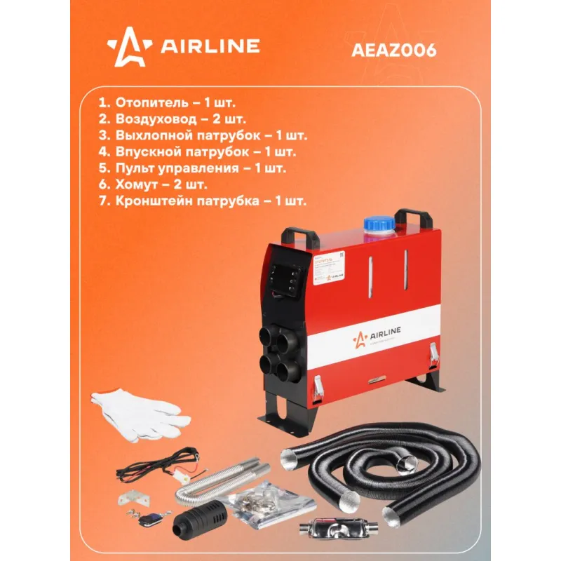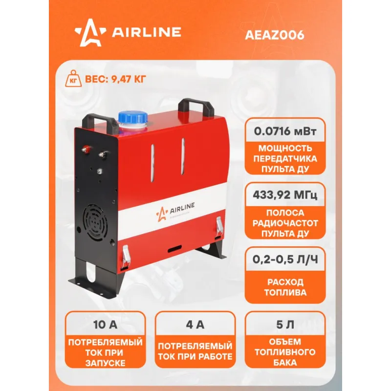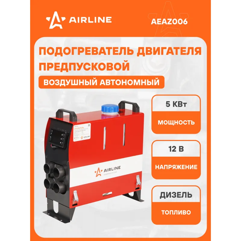 Отопитель воздушный автономный переносной 12В 5000Вт дизель металл. корпус (узкий) Описание: Автономный дизельный воздушный отопитель 12 В 5000 Вт AIRLINE AEAZ006 работает на дизельном топливе и обеспечивает нагрев воздуха в кабине или салоне автомобиля/катера/спецтехники. Забор воздуха для горения и выхлоп отработанных газов производится с улицы. Отопители предназначены: * для обогрева рабочего места; * для обогрева различных помещений ограниченного объема транспортных средств и маломерных судов; * для поддержания комфортной температуры в помещении в течении длительного времени. Автоматическое выключение отопителя происходит: * при перегреве теплообменника нагревателя; * при превышении температуры нагретого воздуха; * при падении напряжения ниже 10В или его повышении свыше 16В; Запрещается использовать в непроветриваемых помещениях. Отопитель может быть смонтирован как внутри, так и снаружи транспортного средства. В случае монтажа снаружи транспортного средства, место монтажа должно быть защищено от неблагоприятных факторов (вода, снег, грязь) при помощи защитного кожуха. Руководство по монтажу и эксплуатации в комплекте. Товар официального производителя AIRLINE. Характеристики: Артикул: AEAZ006 Мощность, Вт: 5000 Напряжение питания, В: 12 Мощность передатчика пульта ДУ, мВт: 0.0716 Объём топливного бака, л: 5 Полоса радиочастот пульта ДУ, МГц: 433.92 Потребляемый ток при запуске, не более, А: 10 Потребляемый ток при работе, не более, А: 4 Расход топлива, л/ч: 0.2 - 0.5 Вид топлива: дизель Комплектация: Хомут - 2 шт Кронштейн патрубка - 1 шт Отопитель - 1 шт Воздуховод - 2 шт Впускной патрубок - 1 шт Выхлопной патрубок - 1 шт Пульт управления - 1 шт Гарантия: от 1 года.