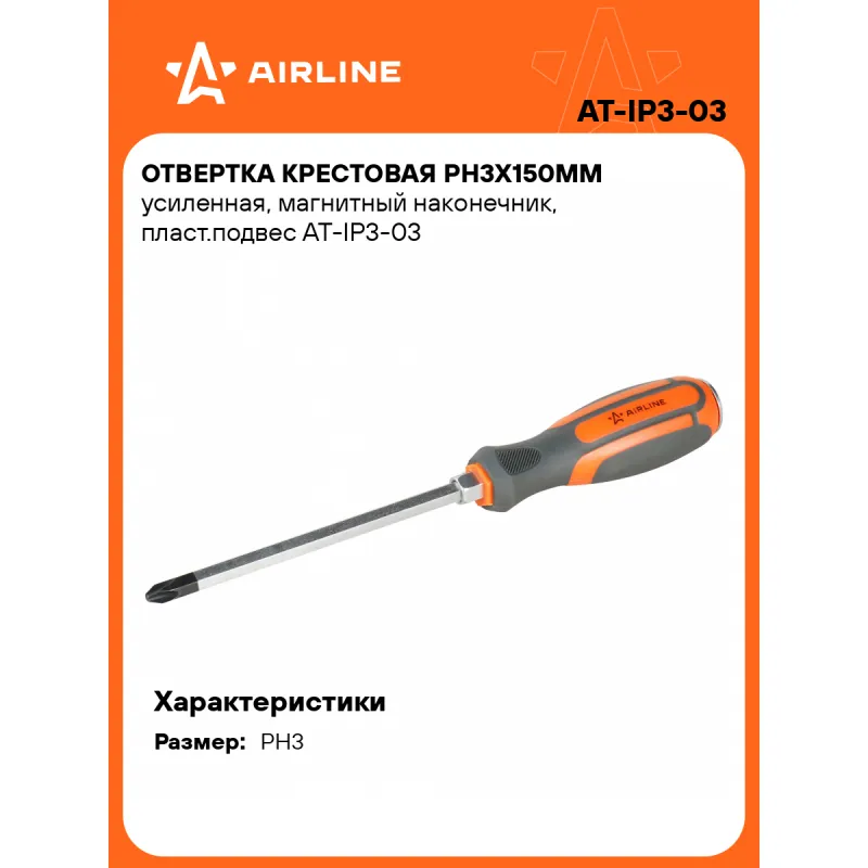 Отвертка крестовая PH3х150мм усиленная, магнитный наконечник, пласт.подвес Описание: Отвертка крестовая PH3 от бренда AIRLINE - многофункциональный инструмент для ремонта и строительства для машины, для дома, для дачи, для авто. Сочетание твёрдых и мягких элементов рукоятки оптимально распределяет усилие, прилагаемое к инструменту, и предотвращает проскальзывание. Эргономичный дизайн облегчает работу. Отвёртки AIRLINE удобно подвешиваются за специальное отверстие. Лезвие отвёрток AIRLINE изготовлено из хром-ванадиевой стали, жало подвержено индукционной закалке и фосфатировано. Особенности: - Магнитный наконечник; - Подойдут для дома, для гаража, для любых бытовых задач, многофункциональная, для ремонта, для сборки мебели, для автомобиля; - Размер: PH3; - Высокая степень передачи крутящего момента от отвертки; - Материал стержня - CRV; - Материал рукоятки - двухкомпонентная, прорезиненная; - Подвес инструмента; Товар официального производителя AIRLINE будет идеальным дополнение в профессиональный набор инструментов автомобилиста. Отлично подойдет в качестве практичного подарка мужчинам, женщинам, автомобилисту, папе, отцу, мужу, парню и другу на Новый год, день рождения и без повода, незаменимый строительный инструмент и оснастка сверление, долбление, закручивание для дома, автосервиса, для профессионального использования. Характеристики: Артикул: AT-IP3-03 OEM номера: 742036, D71P3150 Размер: PH3 Длина жала отвёртки, мм: 150 Материал стержня: CRV Материал рукоятки: двухкомпонентная Комплектация: Отвёртка - 1 шт Гарантия: от 1 года.