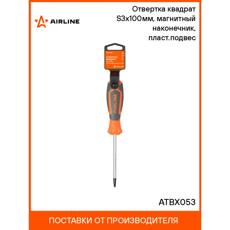 Отвертка квадрат S3x100мм, магнитный наконечник, пласт.подвес Описание: Сочетание твёрдых и мягких элементов рукоятки оптимально распределяет усилие, прилагаемое к инструменту, и предотвращает проскальзывание. Эргономичный дизайн облегчает работу. Отвёртки AIRLINE удобно подвешиваются за специальное отверстие. Лезвие отвёрток AIRLINE изготовлено из хром-ванадиевой стали, жало подвержено индукционной закалке и фосфатировано. Характеристики: Артикул: ATBX053 Размер: S3 Длина жала отвёртки, мм: 100 Материал стержня: CRV Материал рукоятки: двухкомпонентная Комплектация: Отвертка - 1 шт Гарантия: от 1 года.