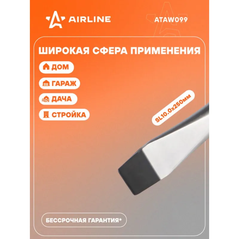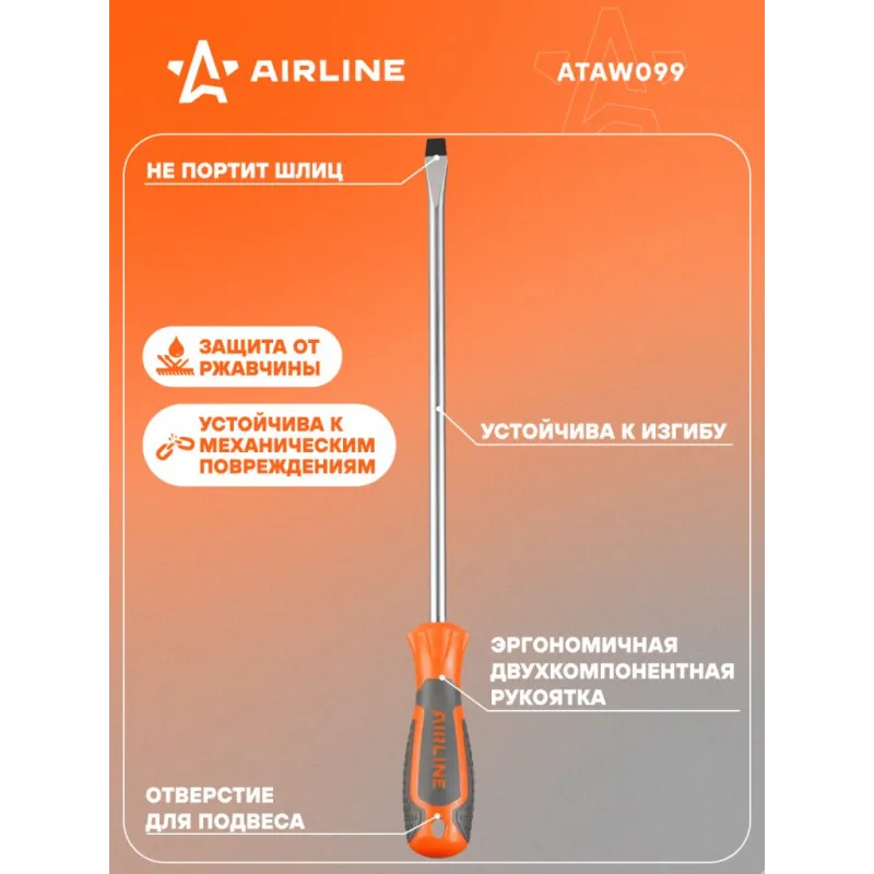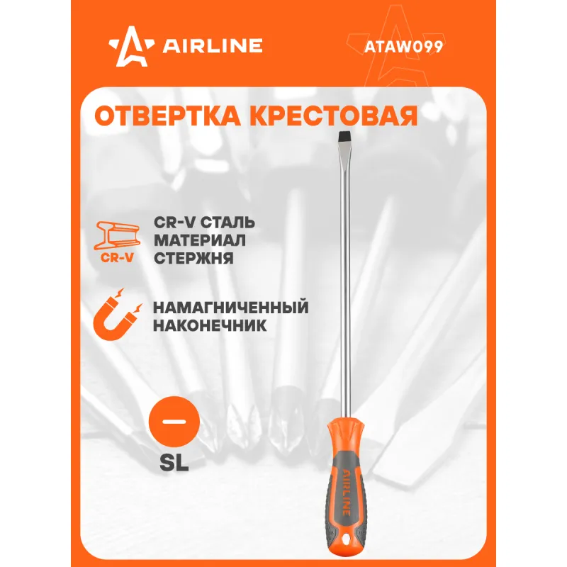 Отвертка шлицевая SL10.0x250мм, магнитный наконечник, пласт.подвес Описание: Отвертка прямая шлицевая SL10 от бренда AIRLINE многофункциональный инструмент для ремонта и строительства для машины, для дома, для дачи, для авто. Композитные рукоятки отвёрток выполнены из прочного пластика в сочетании с более мягкими резиновыми вставками в местах хвата. Такая компоновка равномерно распределяет прилагаемое усилие, обеспечивая безопасную работу для кисти и запястья. Эргономичный дизайн облегчает работу. Лезвие отвёрток AIRLINE изготовлено из хром-ванадиевой стали, жало подвержено индукционной закалке и фосфатировано. Особенности: - Магнитный наконечник; - Эргономичная ручка; - Подойдут для дома, для гаража, для любых бытовых задач, многофункциональная, для ремонта, для сборки мебели, для автомобиля; - Размер: SL10; - Длина жала отвёртки - 250 мм; - Высокая степень передачи крутящего момента от отвертки; - Материал стержня - CRV; - Материал рукоятки - двухкомпонентная, прорезиненная, стойки к воздействию масел и бензина; - Подвес инструмента; Товар официального производителя AIRLINE будет идеальным дополнение в профессиональный набор инструментов автомобилиста. Отлично подойдет в качестве практичного подарка мужчинам, женщинам, автомобилисту, папе, отцу, мужу, парню и другу на Новый год, день рождения и без повода, незаменимый строительный инструмент и оснастка сверление, долбление, закручивание для дома, автосервиса, для профессионального использования. Характеристики: Артикул: ATAW099 Размер: SL10 Длина жала отвёртки, мм: 250 Материал стержня: CRV Материал рукоятки: двухкомпонентная Комплектация: Отвертка - 1 шт Гарантия: от 1 года.