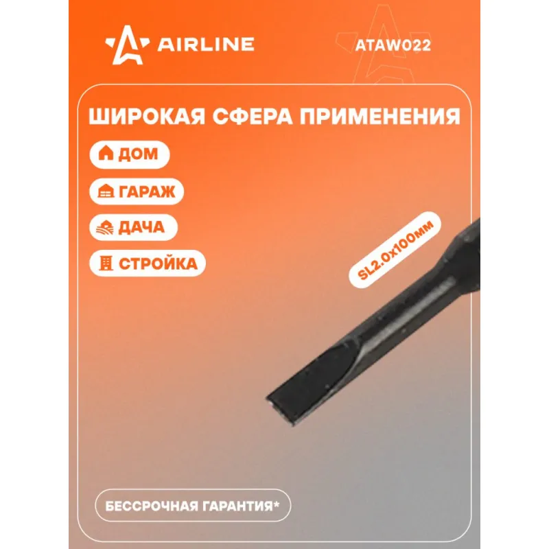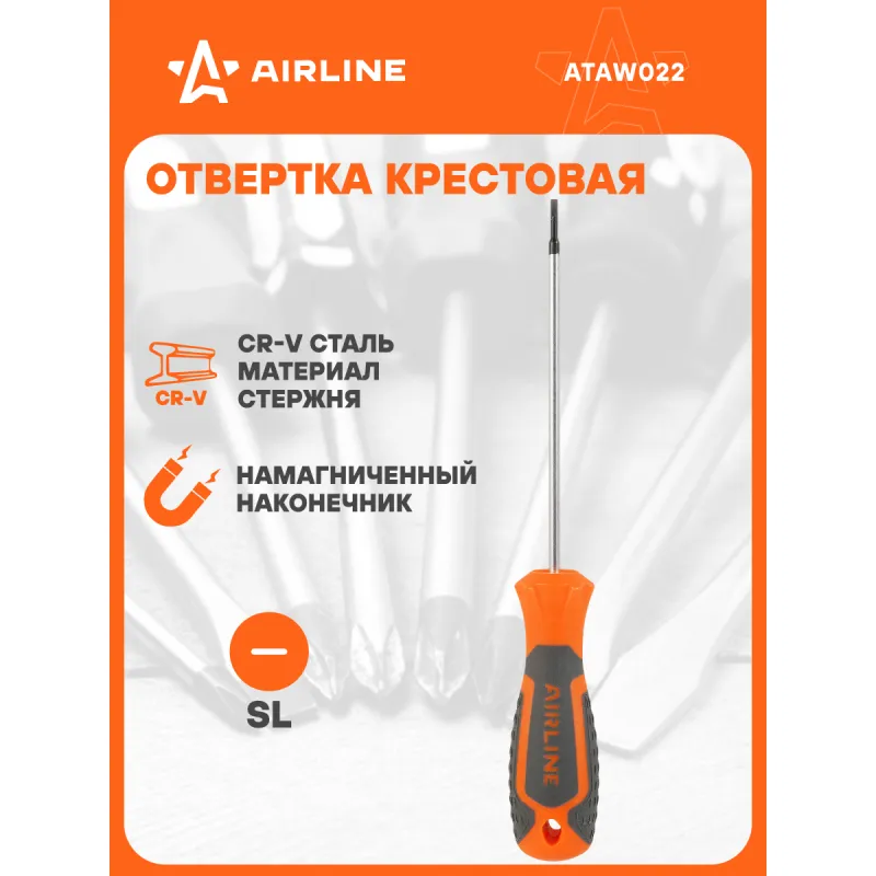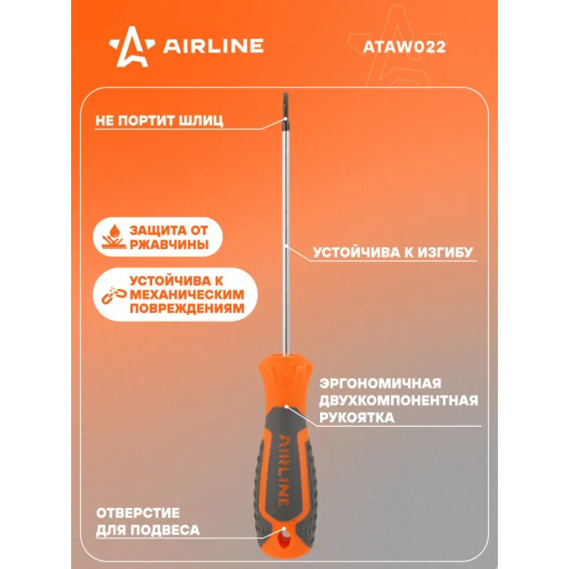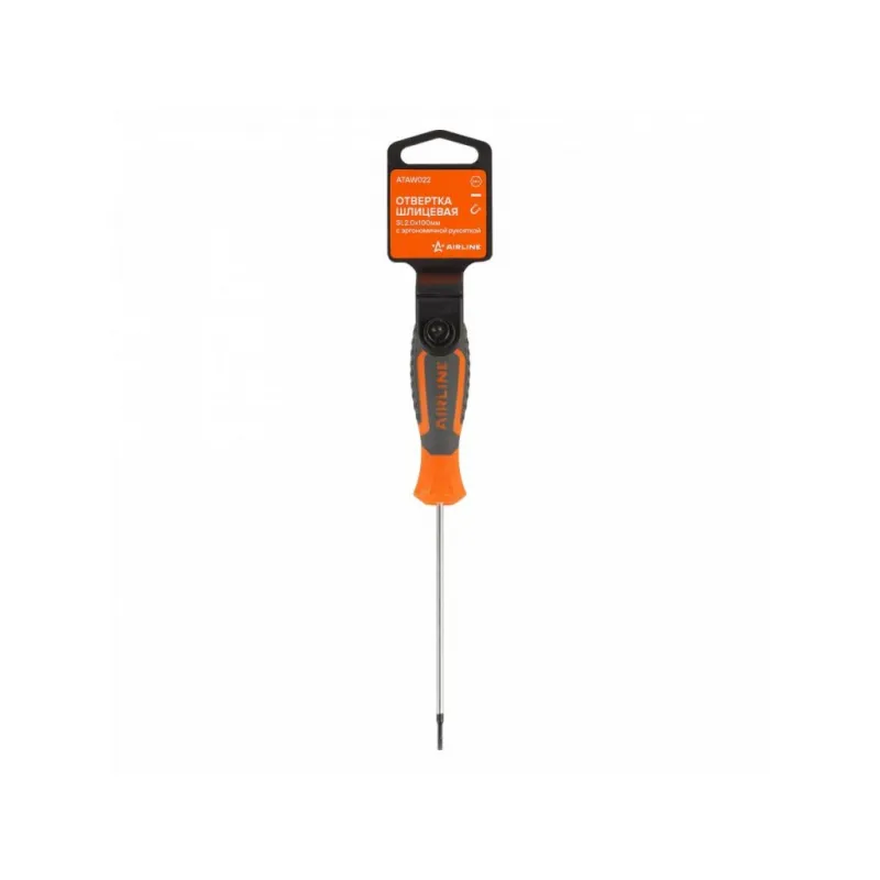 Отвертка шлицевая SL2.0x100мм, магнитный наконечник, пласт.подвес Описание: Отвертка прямая шлицевая SL2.0 от бренда AIRLINE многофункциональный инструмент для ремонта и строительства для машины, для дома, для дачи, для авто. Композитные рукоятки отвёрток выполнены из прочного пластика в сочетании с более мягкими резиновыми вставками в местах хвата. Такая компоновка равномерно распределяет прилагаемое усилие, обеспечивая безопасную работу для кисти и запястья. Эргономичный дизайн облегчает работу. Лезвие отвёрток AIRLINE изготовлено из хром-ванадиевой стали, жало подвержено индукционной закалке и фосфатировано. Особенности: - Магнитный наконечник; - Эргономичная ручка; - Подойдут для дома, для гаража, для любых бытовых задач, многофункциональная, для ремонта, для сборки мебели, для автомобиля; - Размер: SL2.0; - Длина жала отвёртки - 100 мм; - Высокая степень передачи крутящего момента от отвертки; - Материал стержня - CRV; - Материал рукоятки - двухкомпонентная, прорезиненная, стойки к воздействию масел и бензина; - Подвес инструмента; Товар официального производителя AIRLINE будет идеальным дополнение в профессиональный набор инструментов автомобилиста. Отлично подойдет в качестве практичного подарка мужчинам, женщинам, автомобилисту, папе, отцу, мужу, парню и другу на Новый год, день рождения и без повода, незаменимый строительный инструмент и оснастка сверление, долбление, закручивание для дома, автосервиса, для профессионального использования. Характеристики: Артикул: ATAW022 Размер: SL2.0 Длина жала отвёртки, мм: 100 Материал стержня: CRV Материал рукоятки: двухкомпонентная Комплектация: Отвёртка - 1 шт Гарантия: от 1 года.