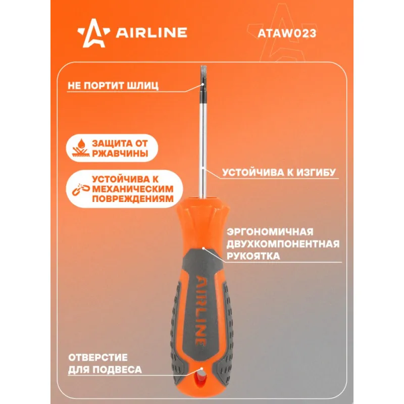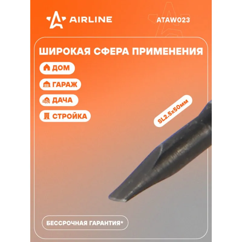 Отвертка шлицевая SL2.5x50мм, магнитный наконечник, пласт.подвес Описание: Отвертка прямая шлицевая SL2.5 от бренда AIRLINE многофункциональный инструмент для ремонта и строительства для машины, для дома, для дачи, для авто. Композитные рукоятки отвёрток выполнены из прочного пластика в сочетании с более мягкими резиновыми вставками в местах хвата. Такая компоновка равномерно распределяет прилагаемое усилие, обеспечивая безопасную работу для кисти и запястья. Эргономичный дизайн облегчает работу. Лезвие отвёрток AIRLINE изготовлено из хром-ванадиевой стали, жало подвержено индукционной закалке и фосфатировано. Особенности: - Магнитный наконечник; - Эргономичная ручка; - Подойдут для дома, для гаража, для любых бытовых задач, многофункциональная, для ремонта, для сборки мебели, для автомобиля; - Размер: SL2.5; - Длина жала отвёртки - 50 мм; - Высокая степень передачи крутящего момента от отвертки; - Материал стержня - CRV; - Материал рукоятки - двухкомпонентная, прорезиненная, стойки к воздействию масел и бензина; - Подвес инструмента; Товар официального производителя AIRLINE будет идеальным дополнение в профессиональный набор инструментов автомобилиста. Отлично подойдет в качестве практичного подарка мужчинам, женщинам, автомобилисту, папе, отцу, мужу, парню и другу на Новый год, день рождения и без повода, незаменимый строительный инструмент и оснастка сверление, долбление, закручивание для дома, автосервиса, для профессионального использования. Характеристики: Артикул: ATAW023 Размер: SL2.5 Длина жала отвёртки, мм: 50 Материал стержня: CRV Материал рукоятки: двухкомпонентная Комплектация: Отвёртка - 1 шт Гарантия: от 1 года.