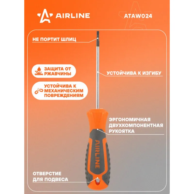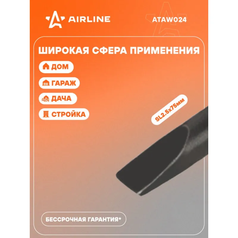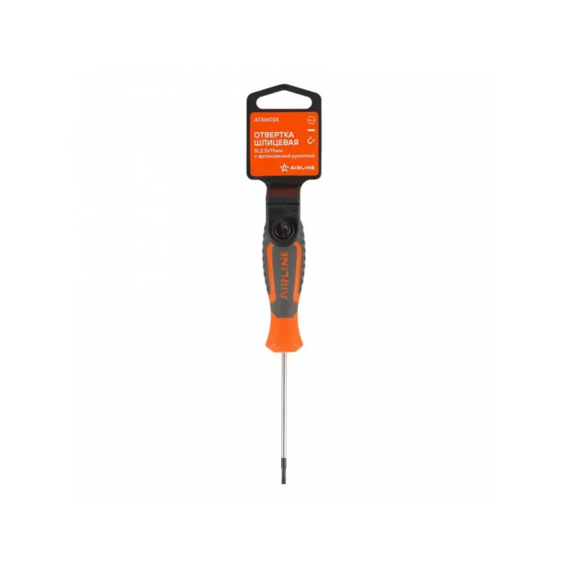Отвертка шлицевая SL2.5x75мм, магнитный наконечник, пласт.подвес Описание: Отвертка прямая шлицевая SL2.5 от бренда AIRLINE многофункциональный инструмент для ремонта и строительства для машины, для дома, для дачи, для авто. Композитные рукоятки отвёрток выполнены из прочного пластика в сочетании с более мягкими резиновыми вставками в местах хвата. Такая компоновка равномерно распределяет прилагаемое усилие, обеспечивая безопасную работу для кисти и запястья. Эргономичный дизайн облегчает работу. Лезвие отвёрток AIRLINE изготовлено из хром-ванадиевой стали, жало подвержено индукционной закалке и фосфатировано. Особенности: - Магнитный наконечник; - Эргономичная ручка; - Подойдут для дома, для гаража, для любых бытовых задач, многофункциональная, для ремонта, для сборки мебели, для автомобиля; - Размер: SL2.5; - Длина жала отвёртки - 75 мм; - Высокая степень передачи крутящего момента от отвертки; - Материал стержня - CRV; - Материал рукоятки - двухкомпонентная, прорезиненная, стойки к воздействию масел и бензина; - Подвес инструмента; Товар официального производителя AIRLINE будет идеальным дополнение в профессиональный набор инструментов автомобилиста. Отлично подойдет в качестве практичного подарка мужчинам, женщинам, автомобилисту, папе, отцу, мужу, парню и другу на Новый год, день рождения и без повода, незаменимый строительный инструмент и оснастка сверление, долбление, закручивание для дома, автосервиса, для профессионального использования. Характеристики: Артикул: ATAW024 Размер: SL2.5 Длина жала отвёртки, мм: 75 Материал стержня: CRV Материал рукоятки: двухкомпонентная Комплектация: Отвёртка - 1 шт Гарантия: от 1 года.