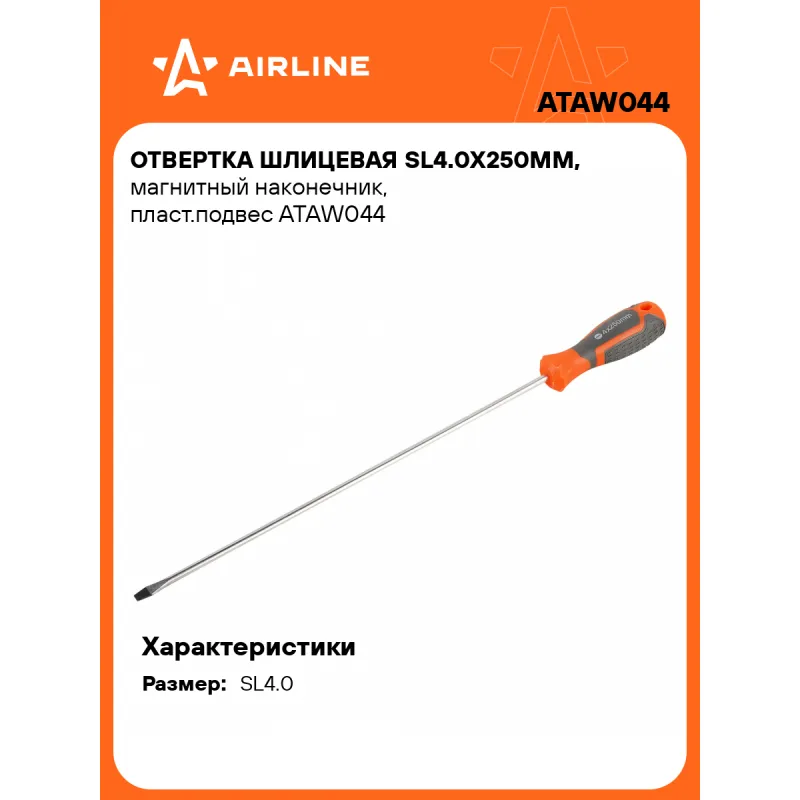 Отвертка шлицевая SL4.0x250мм, магнитный наконечник, пласт.подвес Описание: Отвертка прямая шлицевая SL4.0 от бренда AIRLINE многофункциональный инструмент для ремонта и строительства для машины, для дома, для дачи, для авто. Композитные рукоятки отвёрток выполнены из прочного пластика в сочетании с более мягкими резиновыми вставками в местах хвата. Такая компоновка равномерно распределяет прилагаемое усилие, обеспечивая безопасную работу для кисти и запястья. Эргономичный дизайн облегчает работу. Лезвие отвёрток AIRLINE изготовлено из хром-ванадиевой стали, жало подвержено индукционной закалке и фосфатировано. Особенности: - Магнитный наконечник; - Эргономичная ручка; - Подойдут для дома, для гаража, для любых бытовых задач, многофункциональная, для ремонта, для сборки мебели, для автомобиля; - Размер: SL4.0; - Длина жала отвёртки - 250 мм; - Высокая степень передачи крутящего момента от отвертки; - Материал стержня - CRV; - Материал рукоятки - двухкомпонентная, прорезиненная, стойки к воздействию масел и бензина; - Подвес инструмента; Товар официального производителя AIRLINE будет идеальным дополнение в профессиональный набор инструментов автомобилиста. Отлично подойдет в качестве практичного подарка мужчинам, женщинам, автомобилисту, папе, отцу, мужу, парню и другу на Новый год, день рождения и без повода, незаменимый строительный инструмент и оснастка сверление, долбление, закручивание для дома, автосервиса, для профессионального использования. Характеристики: Артикул: ATAW044 Размер: SL4.0 Длина жала отвёртки, мм: 250 Материал стержня: CRV Материал рукоятки: двухкомпонентная Комплектация: Отвёртка - 1 шт Гарантия: от 1 года.